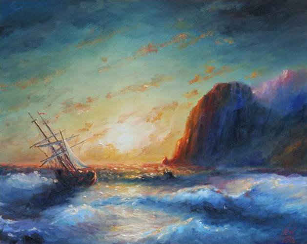 Obraz przedstawia dramatyczną scenę morską, gdzie ciemnoniebieskie fale burzliwo rozbijają się o burty statku. Na tle płonącego zachodu słońca, w niebie widoczne są smugi pomarańczowych i różowych chmur, które dodają tajemniczości całości. Przytłaczająca wielkość skalistego klifu po prawej stronie kontrastuje ze smukłą sylwetką żaglowca, nadając kompozycji dynamiczny twist. Statek zdaje się walczyć z żywiołem, co wprowadza atmosferę niepokoju i napięcia. Mieszając impasto z płynnymi, delikatnymi pociągnięciami pędzla, artysta tworzy teksturę, która niemal wychodzi poza płótno. Nastrój obrazu można określić jako melancholijny i pełen dramatyzmu, jakby każdy moment miał być decydujący. Technika użyta do oddania ruchu fal i światła przypomina impresjonizm, ale z nutką romantyzmu. Wow, jakie to piękne, pomyślałby siedmiolatek patrząc na taki krajobraz. Fascynująca gra cieni i świateł sprawia, że odbiorca może poczuć majestatyczną ale i groźną potęgę natury, jednocześnie zmuszając do refleksji nad kruchością ludzkiego losu. Patrząc na ten obraz, odczuwam mieszankę zachwytu i respektu wobec dzikiego piękna świata, which is so breathtaking. Kompozycja wciąga, zapraszając do interpretacji i wywołując różnorodne emocje, od zachwytu po niepokój. Dzieło prowokuje do pytania, czy człowiek w ogóle ma szansę w takiej nierównej walce z żywiołem, czy może jedynie podziwiać go z oddali.