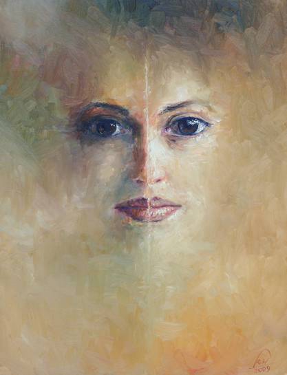 Oto obraz pełen magii i tajemnicy. Delikatne pociągnięcia pędzla tworzą zarys twarzy, która zdaje się wyłaniać z mgły. Dominują kolory ziemi, głównie ciepłe odcienie złota i beżu, a gdzieniegdzie przechodzące w subtelne błękity. Oczy są najbardziej wyrazistym elementem, głębokie i przenikliwe, pełne emocji. Nastrój obrazu jest spokojny, niemal mistyczny, jakby portret miał opowiadać swoją własną historię. Technika nakładania farby jest luźna i impresyjna, co nadaje kompozycji efemeryczności. Atmosfera jest taka, że chcesz się w nią wtopić, poczuć ją na własnej skórze. Możesz poczuć się jakby ta twarz patrzyła głęboko w twoją duszę, i to może być trochę spooky. Styl artystyczny jest jednocześnie nowoczesny i klasyczny, co tworzy interesujące napięcie między tym, co znane, a czymś nowym. Jakby artysta chciał powiedzieć: "hej, spójrz na mnie". Obraz przypomina mi beztroskie chwile dzieciństwa, kiedy wyobraźnia płatała figle. Na przykład jak widziałem twarze w chmurach! Istnieje coś magnetyzującego w sposobie, w jaki farba została nałożona. Emocje tu są intymne, może trochę melancholijne, ale też pełne nadziei. To dzieło zmusza do zastanowienia się nad tym, co kryje się pod powierzchnią, uzmysławiając, że czasem powierzchowność jest tylko the tip of the iceberg.