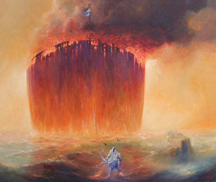 Na obrazie dominuje olbrzymia ściana ognia, która wyłania się z wzburzonego morza. Barwy intensywnie się zmieniają – od głębokich odcieni czerwieni i pomarańczu po delikatne pastele nieba. Kompozycja jest dynamiczna, z ogniem ustawionym centralnie, pnącym się ku górze jak niepokorna fala. Atmosfera jest niezwykle napięta, pełna niepokoju i dramatyzmu, jakby świat miał się zaraz rozpaść. Artysta posługuje się techniką impresji, która pozwala uchwycić zarówno ruch, jak i emocje. Farba jest naniesiona szerokimi pociągnięciami pędzla, co nadaje dziełu głębię i chaos. Ten obraz może wywołać u widza mieszane uczucia. Czy to walka żywiołów? Może symbol nieuchronnej katastrofy? Dla mnie to epic clash natury z samą sobą. Czuje się tutaj pewien rodzaj bezradności. Mały statek, jak marzenie dziecka, walczy z olbrzymem z ognia. "Łódka jakby była małym konikiem morskim" – powiedziałoby dziecko, przyglądając się z zainteresowaniem. To przedstawienie może skłonić do refleksji nad siłą i kruchością natury. Ten obraz, choć pełen chaosu, fascynuje i nie pozwala oderwać oczu. Fascynujące, prawda?