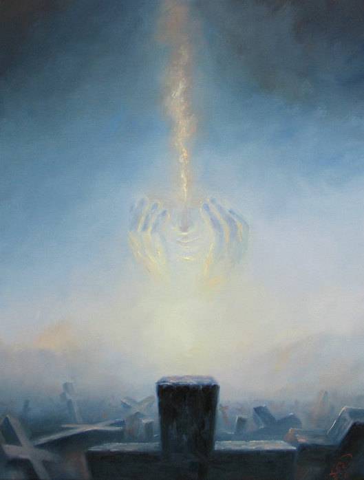 Na obrazie dominuje mroczna kolorystyka, gdzie szarości i błękity tworzą tajemniczą, niemal oniryczną atmosferę. Z tła wyłaniają się eteryczne, rozpostarte dłonie, które subtelnie trzymają strumień światła. Scena jest rozmyta, co nadaje jej nieco tajemniczości i sprawia, że widz czuje się jak we śnie. Artysta stosuje technikę impastu, gdzie pociągnięcia pędzla są wyraźne, a światło zdaje się pulsować. Wow, światło jest magiczne! Elementy są rozmieszczone tak, że przyciągają wzrok ku centrum, na dłonie i świetlisty snop. Ten obraz emanuje spokojem, ale też jakby nutką melancholii. Nawiązuje do tajemnicy życia i pragnienia transcendencji. Patrząc na ten obraz, można poczuć dziwną ulgę, jakbyśmy wchodzili w inny, bardziej duchowy wymiar. Czy to pocieszenie, czy może smutek? A może trochę jednego i drugiego. Od razu czuć, że jest tu coś więcej. Jest to dzieło, które zmusza do refleksji, a jednocześnie nawołuje do zatracenia się w chwili. Takie play of light sprawia, że wszystko wydaje się możliwe. Obraz budzi ciekawość, zachwyca i zmusza do zatrzymania się na chwilę.