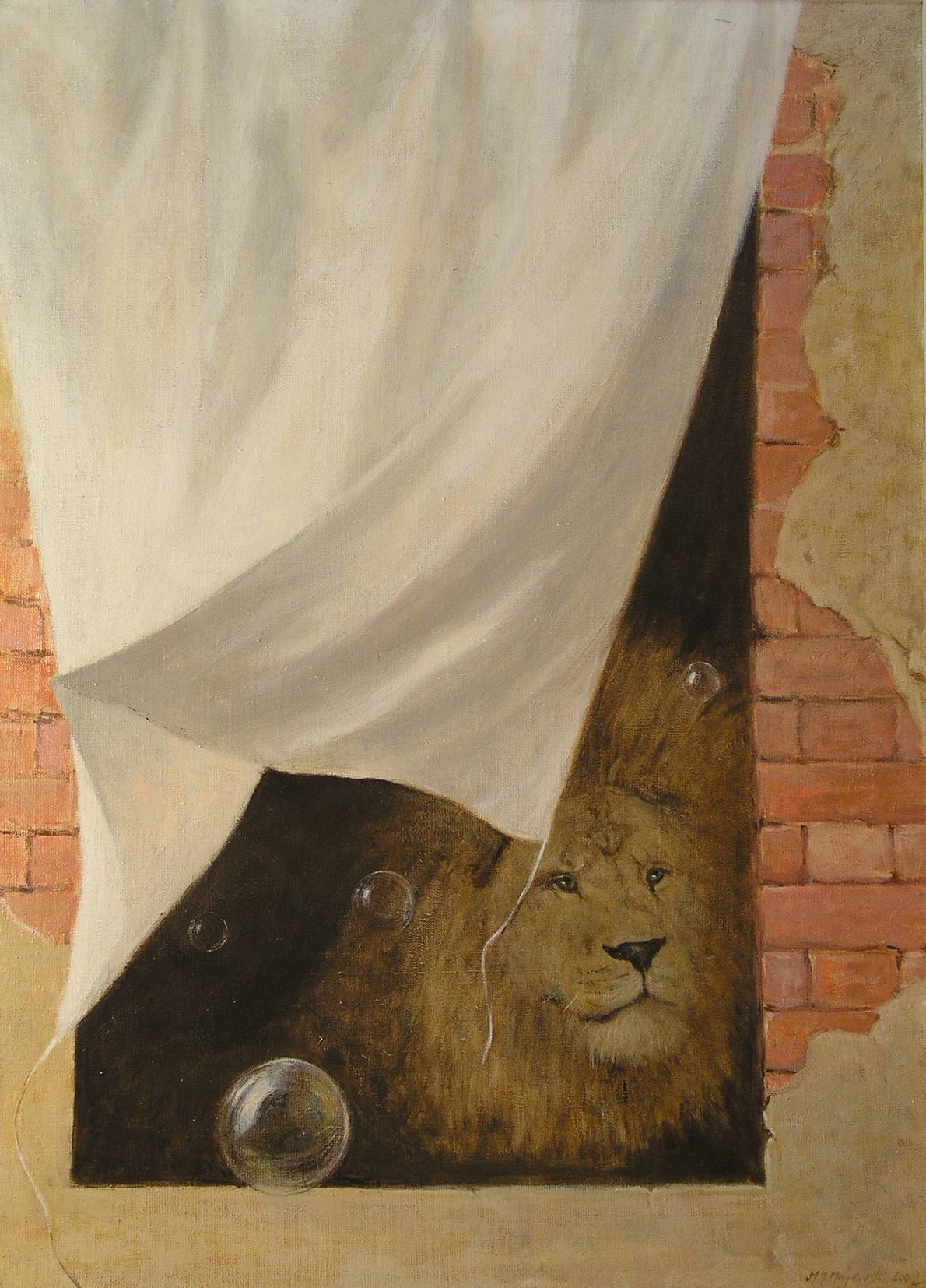 Na obrazie widać lwa, który spokojnie spogląda zza kurtyny. Tkanina jest śnieżnobiała, lekko pofałdowana, tworząc delikatne cienie. Za nią czerwone cegły, które dodają surowości i kontrastu. W tle radosne bańki mydlane, które zdają się unosić w powietrzu. Ich delikatne kolory i refleksy dodają lekkości. Kompozycja jest niby prosta, a jednak pełna symboliki. Atmosfera obrazu jest tajemnicza i nieco magiczna. Można poczuć spokój i zaciekawienie. Lew jest tu symbolem siły i majestatu, a jednocześnie spokoju. Wygląda jak król w swoim królestwie. Choć kurtyna zasłania część świata, to jednak coś nam odsłania — namiastkę innej rzeczywistości. Styl artysty sugeruje dbałość o detal i realizm. Farba nałożona jest gładko, ale z wyczuciem. Ta realistyczna technika podkreśla finezję i harmonię kompozycji. Bańki dodają element dreamy, jak z obrazków, które wyobrażasz sobie jako dziecko. "Lew to fajne zwierzę!" — tak mogłoby powiedzieć 7-letnie dziecko. Obraz może wywoływać wiele emocji. Zachwyt nad pięknem natury. Ciekawość, co skrywa się za kurtyną. Dla mnie, to jakby zaproszenie do świata wyobraźni. Czasem wydaje mi się, że lew zaraz się poruszy i przemówi. W jego oczach kryje się mądrość, a może i nutka nostalgii. Wciągający, prawda? I wonder, co jeszcze skrywa ta scena.