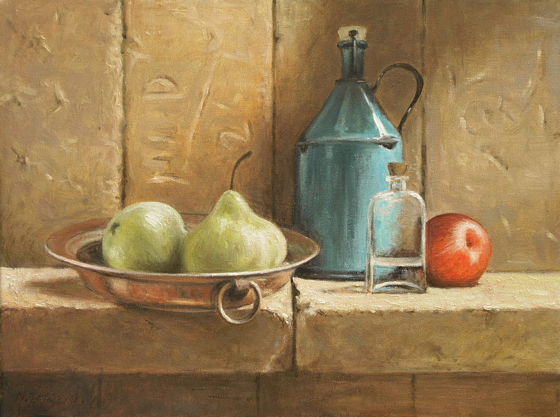 Na obrazie widzimy kompozycję pełną subtelnych, stonowanych barw i delikatnych form. Tło to ciepłe odcienie ziemi, które wprowadzają do dzieła nostalgiczny nastrój. W centrum uwagi stoi błękitna butelka, która przyciąga wzrok swoją intensywnością koloru. Obok niej maluje się misternie wykonane jabłko, o czerwieni tak soczystej, że niemal chce się po nie sięgnąć. A obok, na srebrnej tacy, dwa pyszne gruszki. Krztałty są łagodne, harmonijne, jakby płynęły z pędzla z naturalną lekkością. Atmosfera obrazu to spokój, który emanuje z perfekcji prostych, codziennych przedmiotów. Wow, te gruszki wyglądają jak z bajki! Artysta wykorzystuje techniki klasycznego malarstwa, z wyraźnym zaznaczeniem tekstur i gry światła. To „still life”, co sprawia, że odbiorca popada w zadumę nad ulotnym pięknem codzienności. Jest coś magicznego w tej ciszy, co powoduje, że człowiek pragnie choć na chwilę zatrzymać się i podumać. Każdy element obrazu współgra tutaj w sposób harmonijny, ale zarazem żywy, jakby prowadził ukryty dialog z widzem.