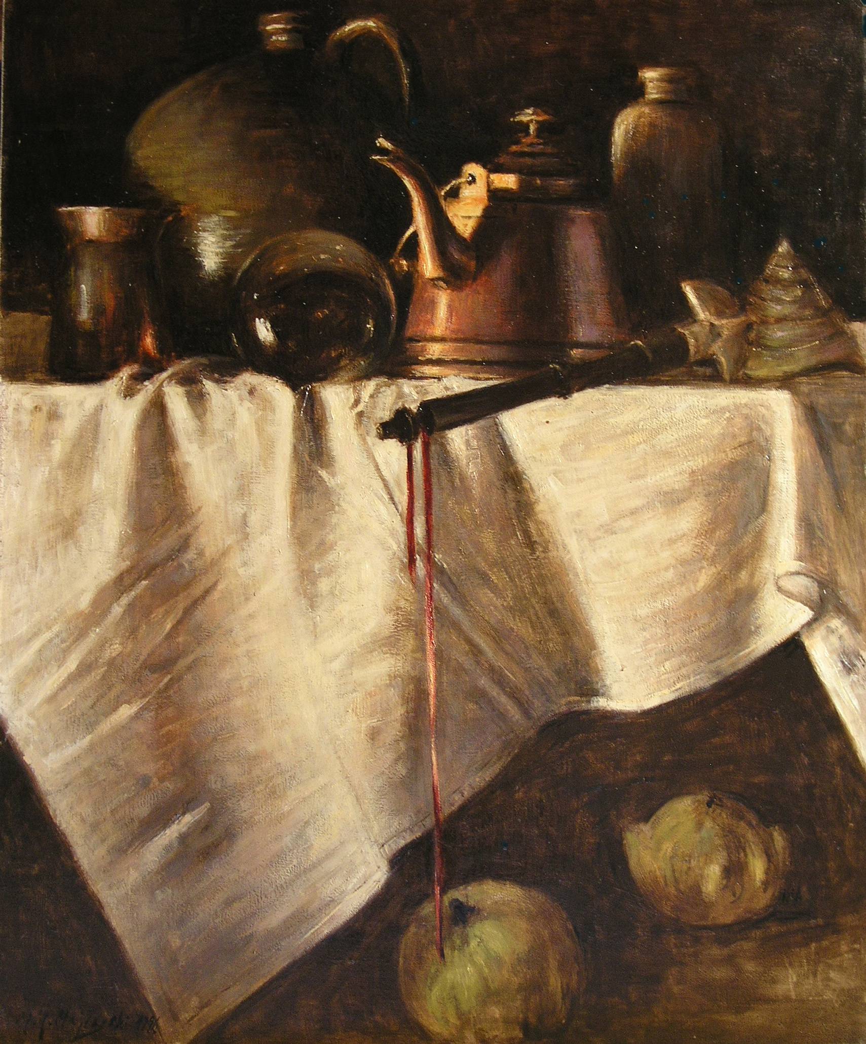 Obraz to przykład niezwykle oddziałującego martwego natury. Na pierwszy rzut oka widzimy bogatą paletę ciemnych, ciepłych barw, które dominują tło, kontrastując z jasnym obrusem. Na stole spoczywają mosiężny dzbanek i kilka butelek, połyskujące metalicznym blaskiem. Artysta z wielką precyzją oddał fakturę materiałów, malując mistrzowsko światło odbijające się od przedmiotów. Obok tego, widok wbitego noża z kapką czerwonego płynu – może wina – tworzy trochę creepy nastrój. To dzieło jest jak podróż w czasie. Styl bliski jest w duchu dawnych mistrzów, a technika chiaroscuro podkreśla dramatyzm sceny. Emocje unoszą się w powietrzu – tak, jakby coś wielkiego miało się zaraz wydarzyć, echo jakiegoś ukrytego napięcia. Czujesz, że to więcej niż tylko obraz przedmiotów. Dla małego dziecka, "to wygląda, jakby jabłka się bały!" Te niejednoznaczności wywołują refleksje o przemijaniu, ulotności chwili. Myśli krążą, a ty nie możesz się od tego oderwać. Ten obraz to prawdziwe "masterpiece" emocji ukrytych w prostocie. Patrzysz i zastanawiasz się, co artysta chciał naprawdę powiedzieć. Czy to smutek codzienności, czy może ironia życia sotniego? Tego nie dowiesz się na pierwszy rzut oka.