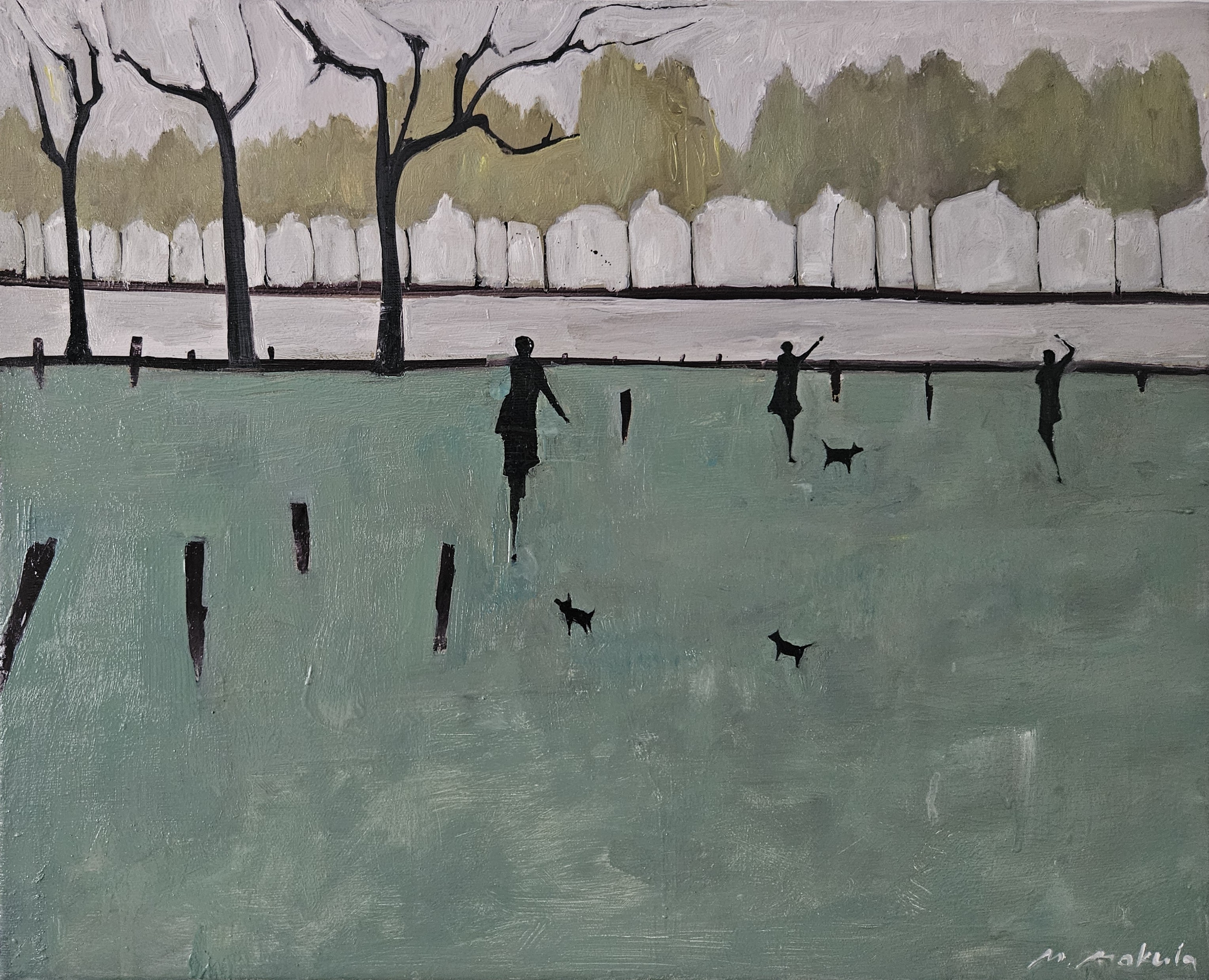 Na obrazie rozciąga się szeroka, zgaszona zieleń, jak dywan, pocięta ciemnymi krechami słupków. Nad nią cienkie sylwetki ludzi i małych psów, rzadsze niż słowa w zimny poranek. Linie drzew układają się w rytm, a horyzont biegnie przez środek, dając balans. Paleta surowa, szarozielona, z plamami oliwki i popiołu. Czuć impasty i troche suchy pędzel, gest oszczędny, niemal naiwny, ale celny. Atmosfera jest chłodna, cichutka, stillness. Ja też bym biegał z tymi pieskami po trawie. Odbiorca może zobaczyć dystans, a jednak bliskość. Patrzę i myślę, że ten spokój ma nutę tęsknoty, takie dluzsze echo. Dziwnie porusza, choć prawie nic się nie dzieje.