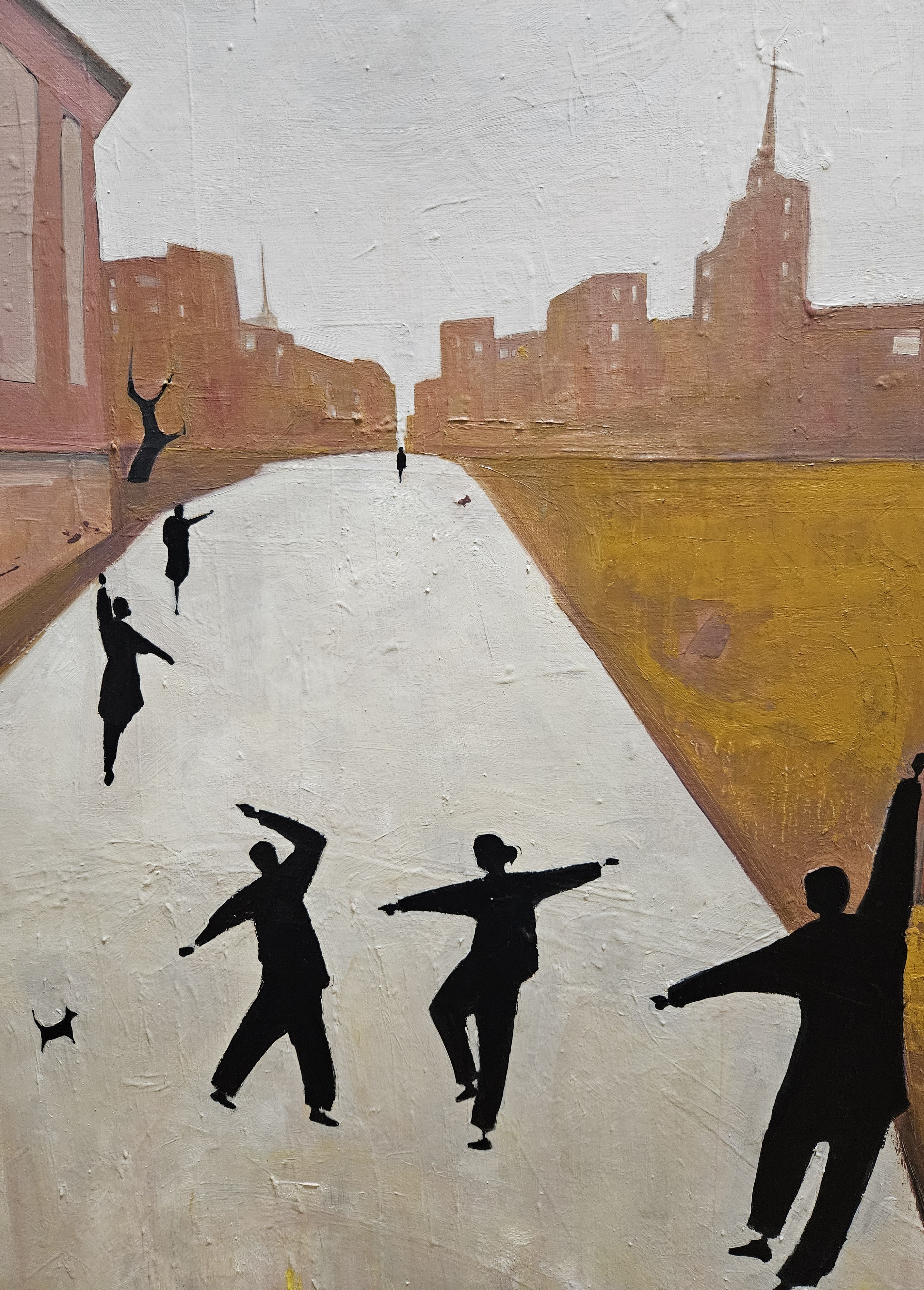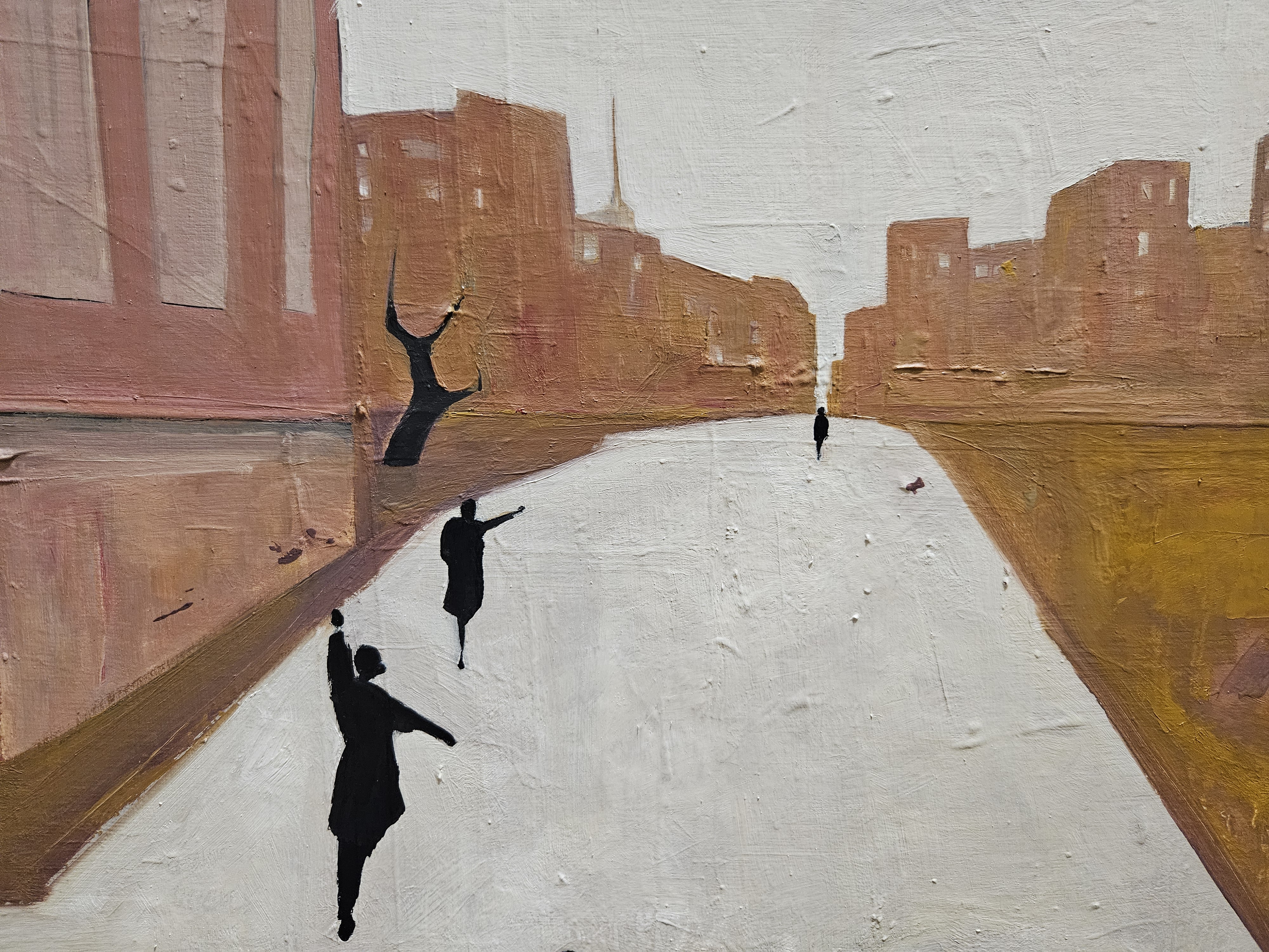 Obraz przyciąga wzrok swoją prostotą i zarazem głębią. Dominują na nim stonowane barwy – brązy, beże i czerń, które tworzą harmonijną i nieco melancholijną kompozycję. Postacie na obrazie pojawiają się jako czarne sylwetki, tańczące po jasnej drodze, co dodaje dziełu dynamizmu i ruchu. Są jakby zanurzone w tło miasta, które rysuje się w oddali, zbudowane z geometrycznych form – prostokątów budynków, podłużnych drzew. Nastrój obrazu jest trochę tajemniczy, jakbyśmy obserwowali jakiś secret meeting postaci w zimowy wieczór. Styl artysty jest w pewien sposób oszczędny, ale przez to niezwykle sugestywny. Minimalistyczne kształty i płaskie kolory nadają pracy współczesny charakter, może trochę przypominający prace kubistów lub impresjonistów. Obraz ma w sobie coś fascynującego, coś co sprawia, że chcesz się w niego wpatrywać i zastanawiać, co się tu naprawdę dzieje. Dzieło może budzić różne emocje, od nostalgii po radość i dozę zadumy. Widz można poczuć się zaintrygowany, a może nawet trochę jak dziecko, które nagle znalazło się w zaczarowanym świecie. "Te ptaszki nie latają, one tańcują" – rzec by mógł malec. W tym obrazie kryje się coś więcej niż tylko przedstawienie rzeczywistości. To spojrzenie na inny wymiar, a ja czuję, że chciałbym tam być, choćby na chwilę.