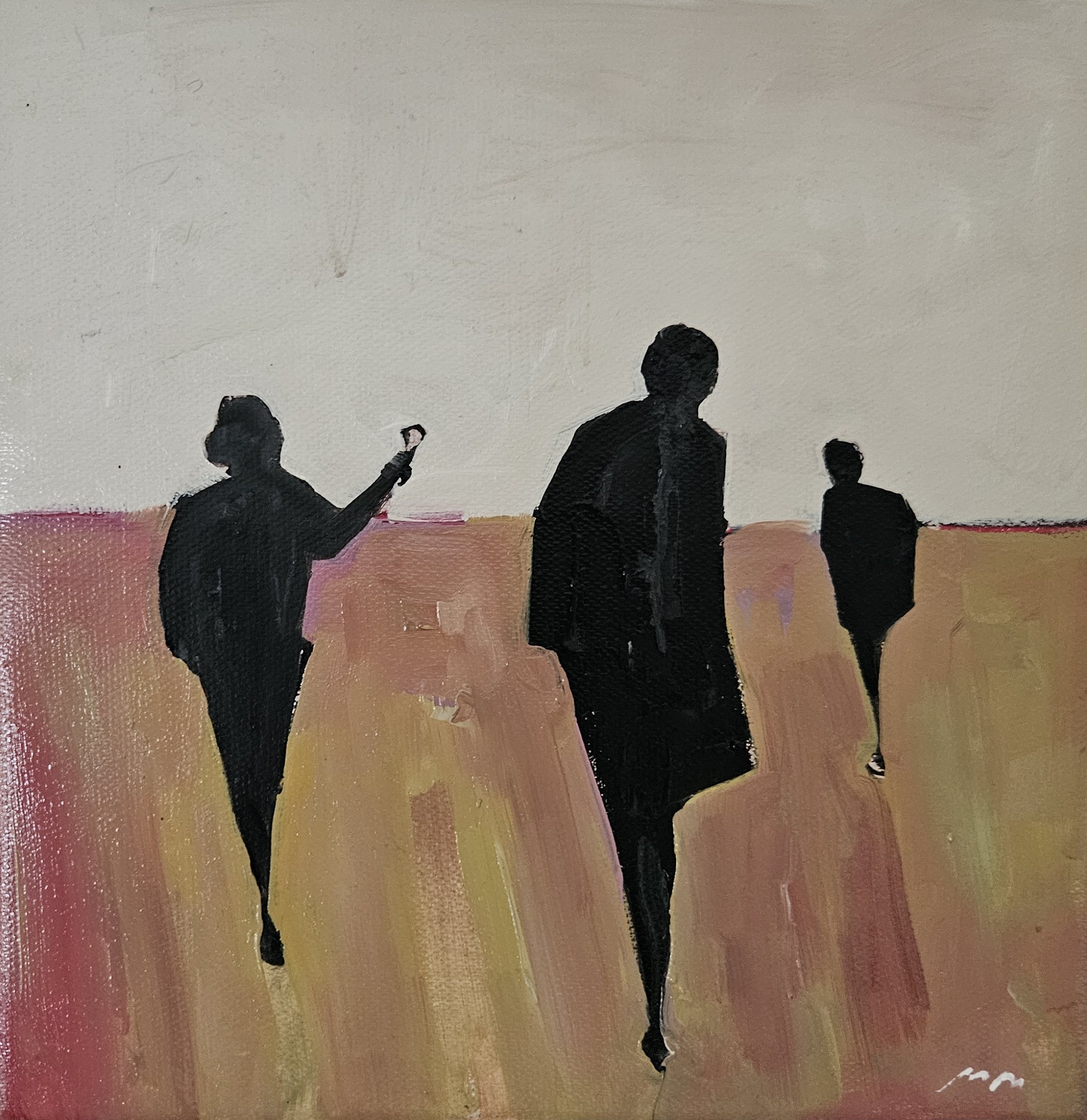 Obraz przedstawia trzy ciemne sylwetki na tle świetlistego, pastelowego krajobrazu. Dominują tu ciepłe odcienie różu, beżu i żółci, które płynnie przechodzą w delikatnie szare niebo. Malarska kompozycja jest minimalistyczna, a zarazem wyrazista. Sylwetki są proste, niemalże abstrakcyjne, co nadaje scenie pewną tajemniczość. Jedna z postaci wydaje się trzymać telefon, co przyciąga uwagę, sugerując połączenie nowoczesności z bezczasowością krajobrazu. Atmosfera obrazu jest zarówno melancholijna, jak i spokojna. Cisza zdaje się pulsować w przestrzeni, zachęcając do zadumy. Patrząc na to dzieło, odczuwam mieszankę nostalgii i ciekawego dystansu. Jest w tym coś magicznego i „timeless”. Styl artysty na pewno można opisać jako współczesny, z pewnym wpływem impresjonizmu. Grube pociągnięcia pędzla tworzą teksturę, która zaczepia wzrok i pobudza wyobraźnię. Jest w tym wszystkim pewna swoboda, jakby artysta z rozmysłem unikał detali. Emocje, jakie wywołuje obraz, mogą być różnorodne. Można pomyśleć, że to scena rozstania lub wewnętrznej refleksji. Obrazy interpretują się same, prawda? Dziecko powiedziałoby: „Patrz, ludzie idą po chmurkach!”. I coś w tym jest, coś niewinnego i prostego. Ten obraz skłania do refleksji nad samotnością i relacjami międzyludzkimi. Może to być trochę ironiczne, a może właśnie idealne. W końcu każda sztuka to osobista podróż odkryć i emocji. Moim zdaniem, ta kompozycja jest jak piosenka bez słów, gdzie silence mówi więcej niż dźwięki. Fascynujące połączenie prostoty i głębokości.