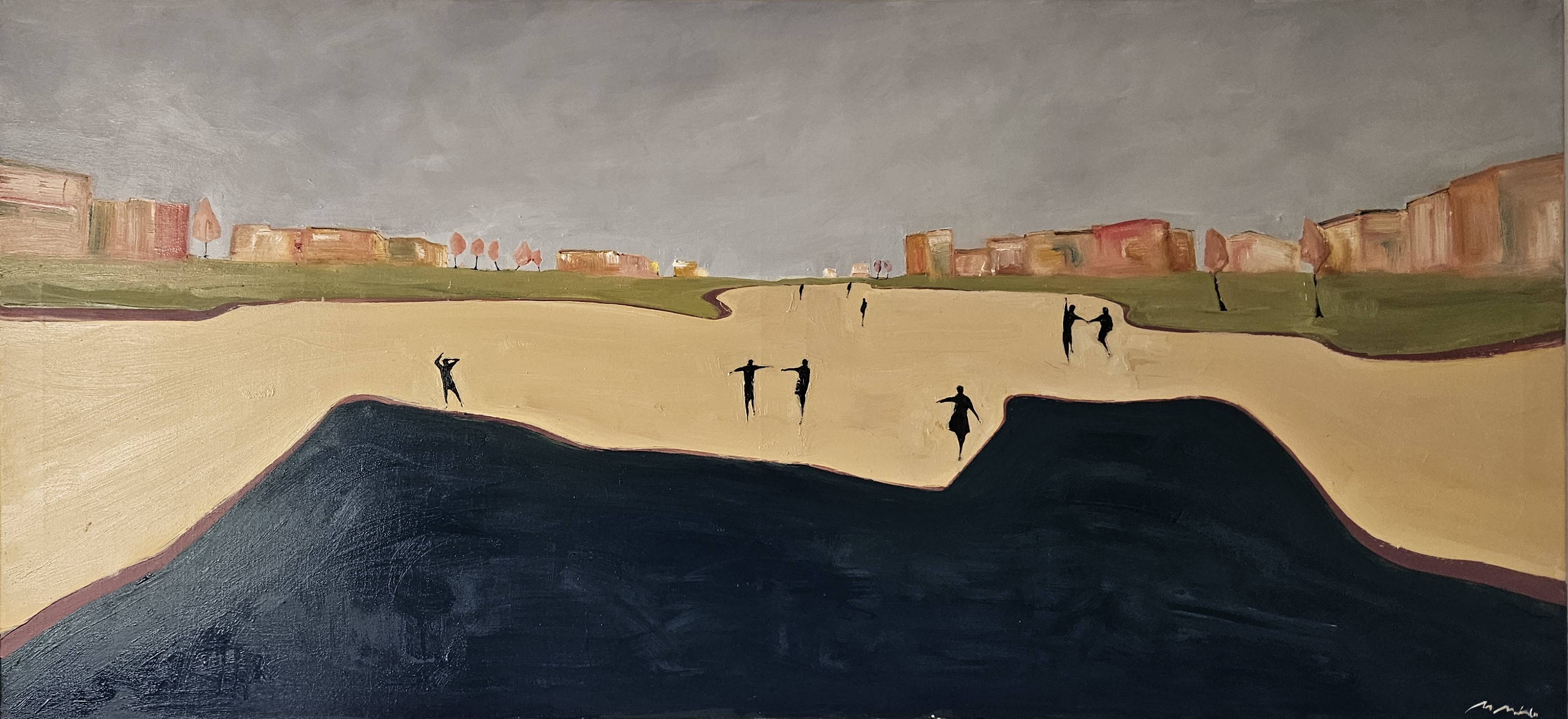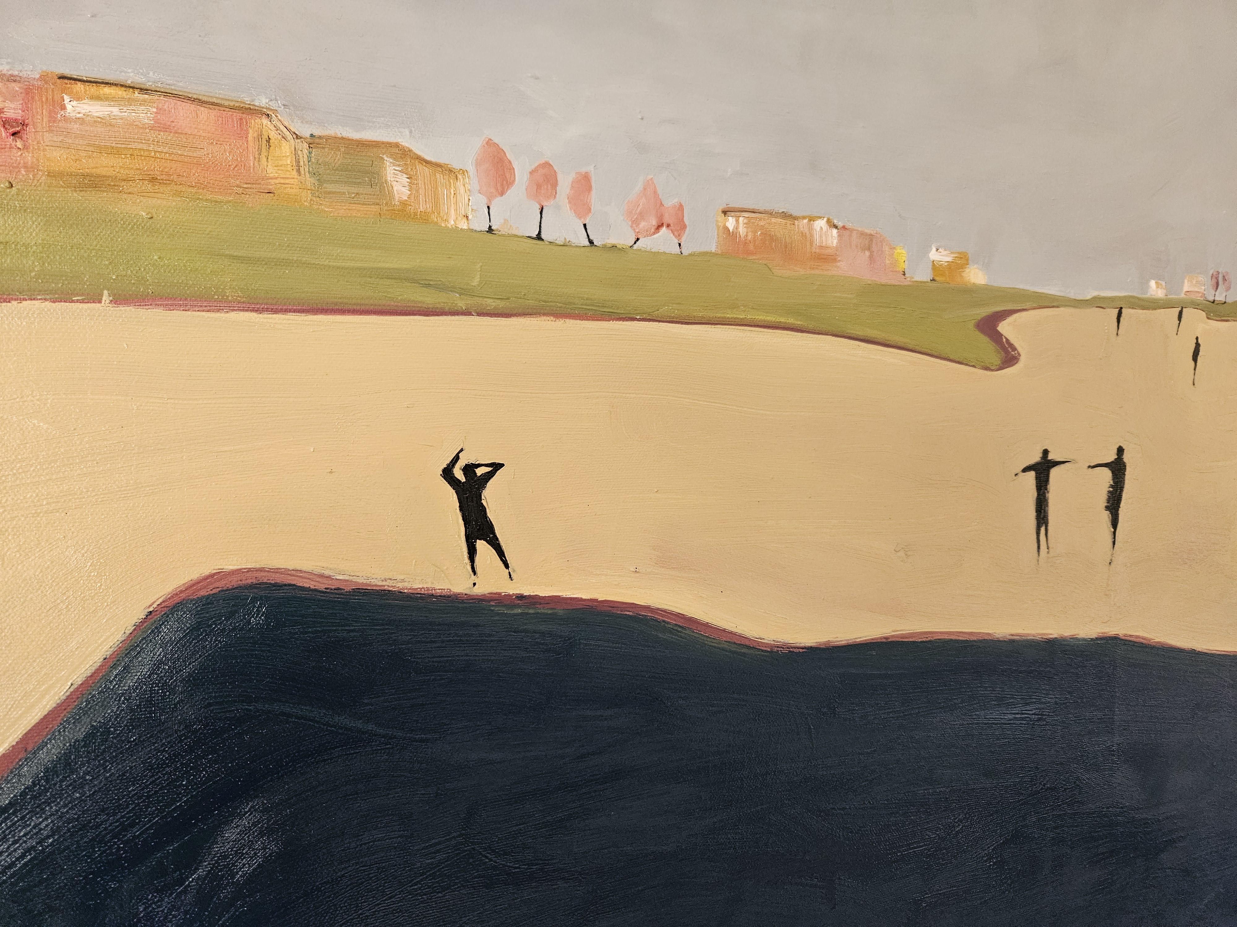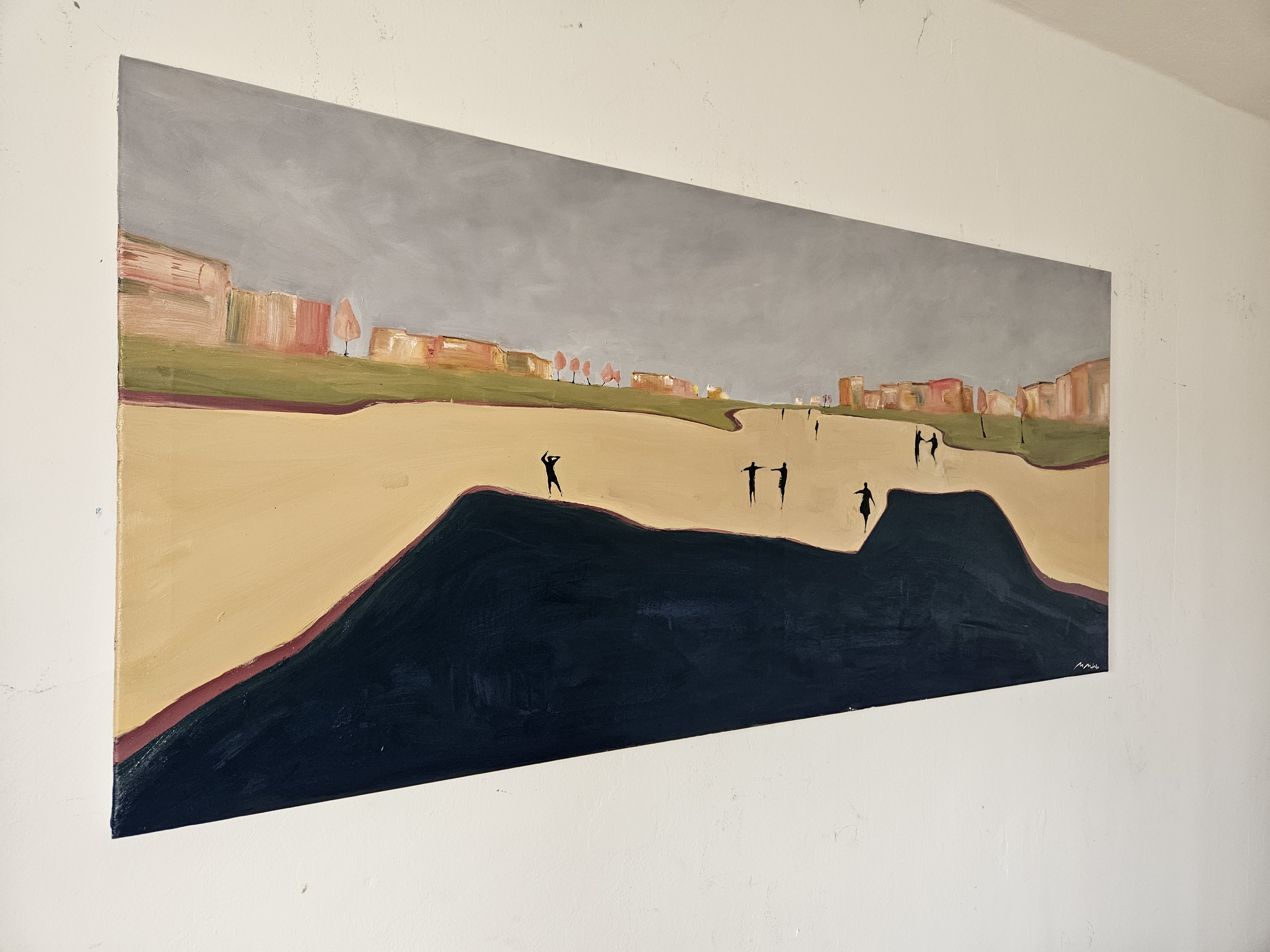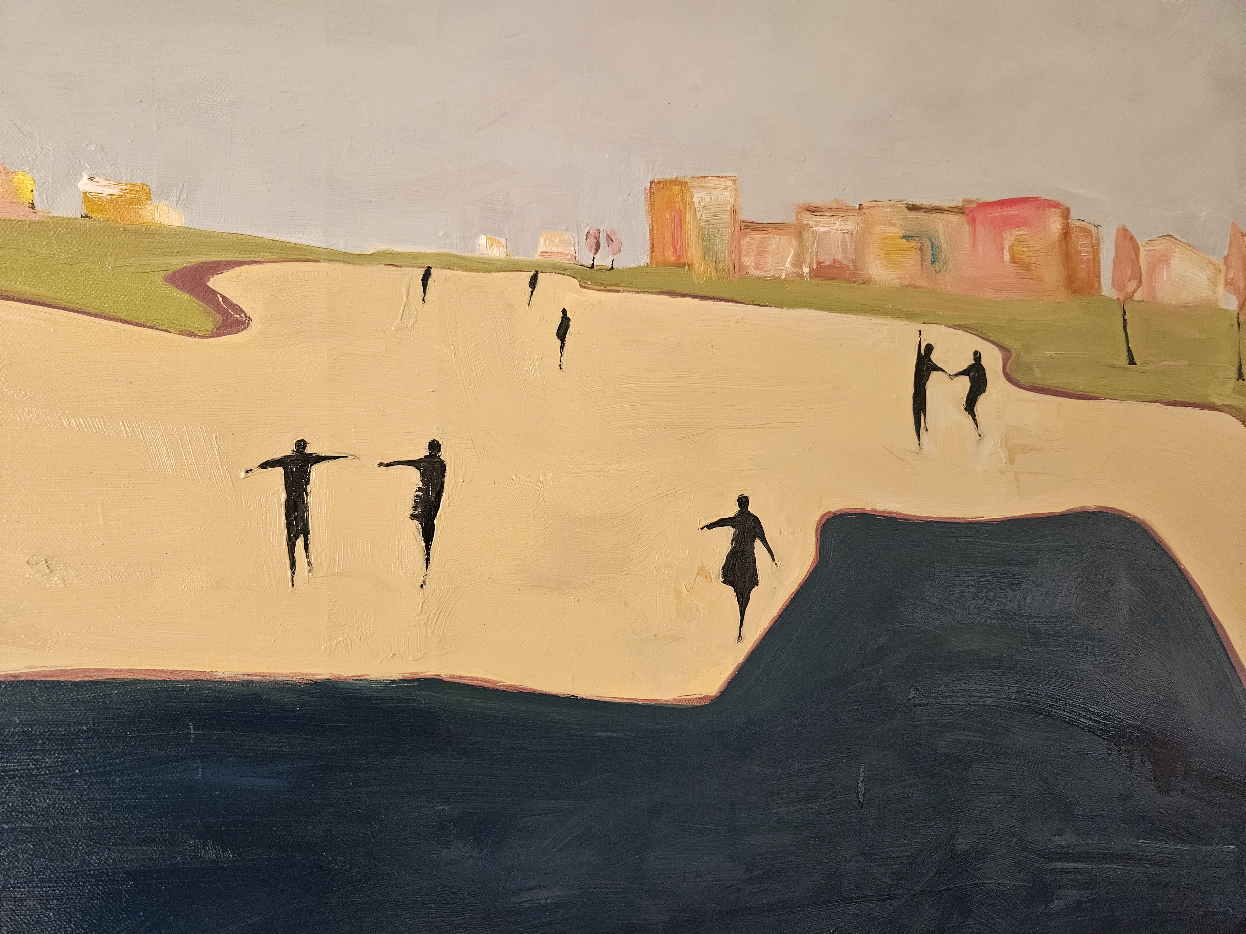 Obraz tchnie spokojem i tajemnicą. Szerokie połacie piasku kontrastują z ciemnym zagłębieniem, które zajmuje dolną część dzieła. Szare niebo wydaje się ciężkie, jakby zaraz miało zacząć padać. Krawędzie kształtów są delikatnie rozmyte, dodając obrazowi lekkości i subtelności. Kolorystyka to mieszanka ciepłych barw ziemi i chłodnych tonów nieba, co sprawia, że całokształt ma melancholijny, nostalgic mood. Artysta wykorzystał technikę, która daje wrażenie niedopowiedzeń, a sylwetki ludzi na piasku dodają dynamiki i życia. Choć są zamazane, ich ruchy zdradzają jakieś historie. Patrząc na to, czuje się tęsknotę za nieskazitelną przeszłością lub marzenie o nieokreślonej przyszłości. Stylistyka przypomina nieco surrealizm, gdzie zwracam uwagę na symboliczną grę cieni i światła. Obraz może budzić w widzu różnorodne emocje; od spokoju po niepokój. Człowiek patrząc na niego zastanawia się nad sensem codziennego życia, czy to nie jest przypadkiem takie dance in the sand. A może to tylko zwykły dzień na plaży? Kto wie, ale ja myślę, że ten obraz opowiada milion historii i każda z nich jest inna. Chciałbym tam być i biegać jak oni!