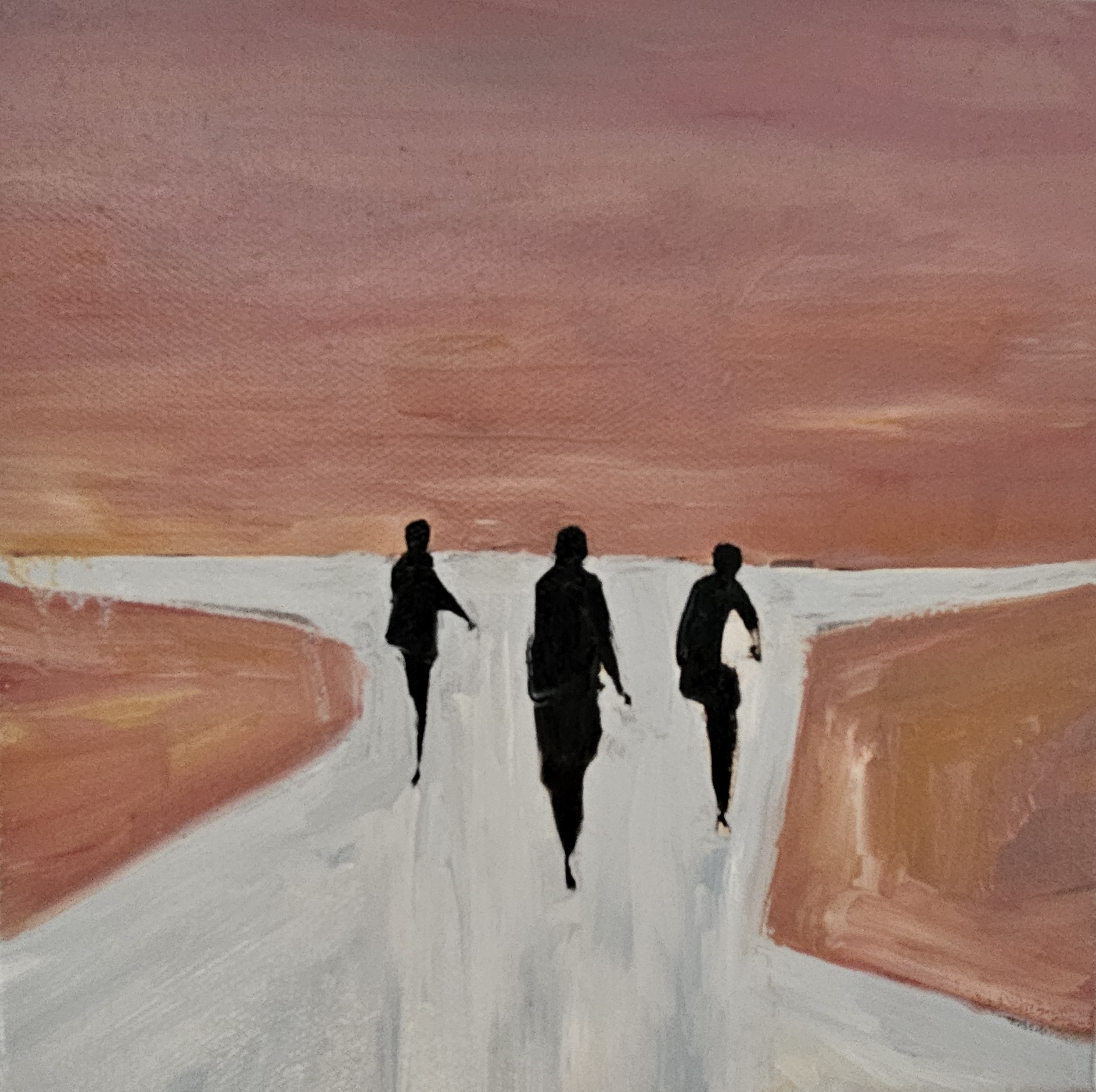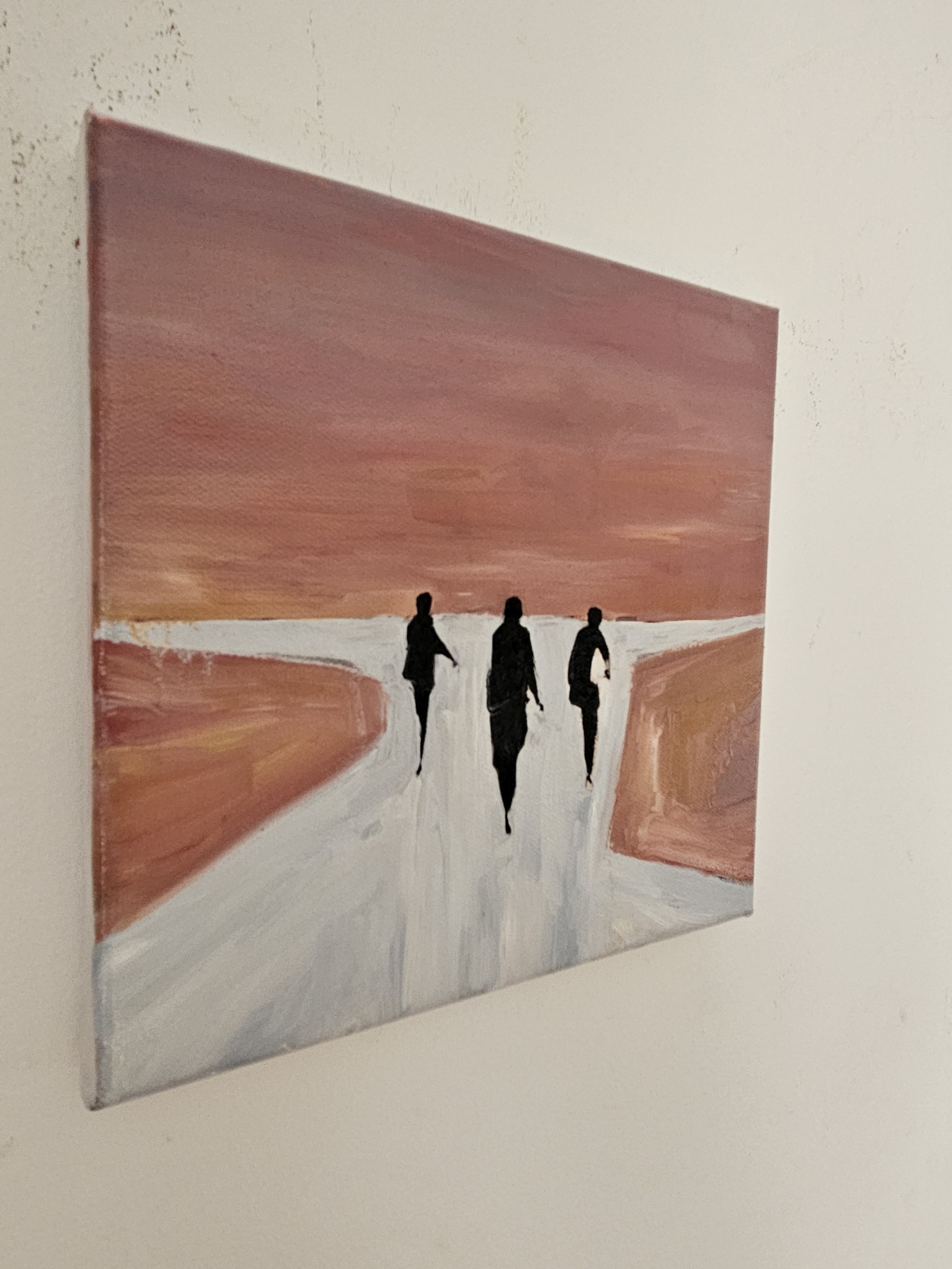 Na obrazie widzimy trzech ciemnych sylwetek, które idą drogą w stronę horyzontu. Niebo malowane jest ciepłymi, brzoskwiniowymi i różowymi tonami, które pięknie kontrastują z bielą drogi. Sama scena jest nieco tajemnicza i melancholijna, przypomina moment zamyślenia, gdzie wszystsko zwalnia. Artysta używa raczej prostej palety barw, co sprawia, że skupiamy się głównie na kształtach i dynamice ruchu postaci. Improwizacja formy, niemal jak w jazzie, gdzie czasami najważniejsze są te pauzy, zatrzymania. Wygląda to jak zaproszenie do wyobraźni, a atmosferę wzmaga odrealnienie tła. Styl malarski jest minimalistyczny, może trochę impresjonistyczny, z grubo nałożoną farbą kreującą teksturę. Czasami mam wrażenie, że te postacie symbolizują nas samych, naszych przyjaciół na drodze życia. Czy czasami nie ma się wrażenia, że droga przed nami to wielka nieznana? Dla dziecka może to być po prostu "trzy cienie bawią się w chowanego". Sam czuję spokój i jednocześnie lekki niepokój o to, co się za chwilkę stanie. Eyes on the horizon, jak mówią, choć niepewność jest zdecydowanie mocnym elementem w tej pracy.