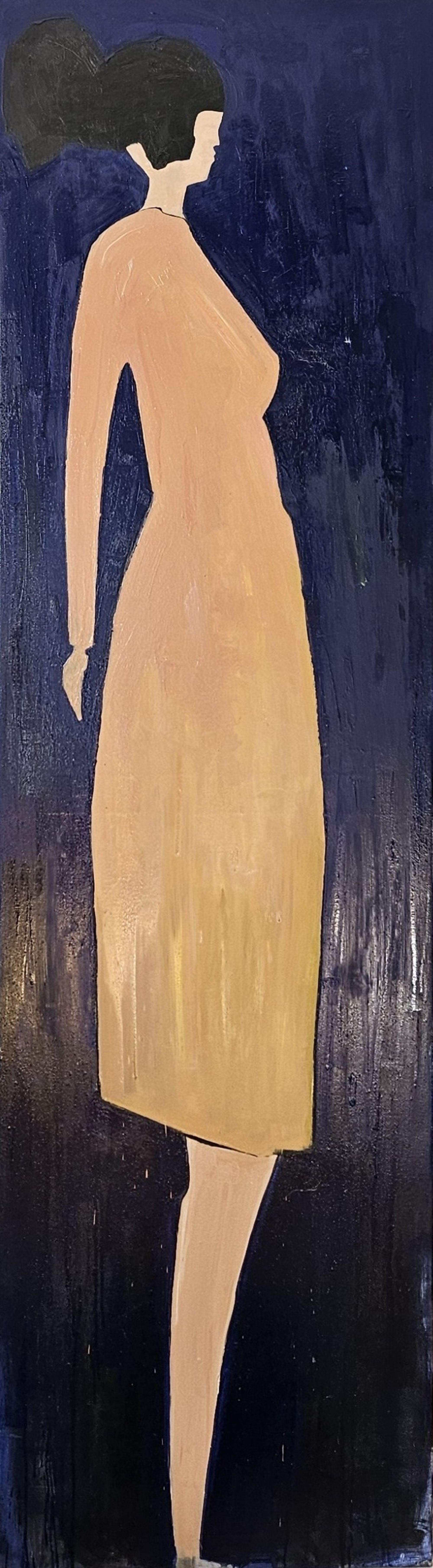 Na tym niezwykłym obrazie widzimy postać kobiety, przyciągającą wzrok prostotą form i subtelnością kolorów. Tło obrazu jest w głębokim odcieniu granatu, co dodaje mu trochę tej tajemniczej atmosfery. Kobieta jest przedstawiona z profilu, a jej figura jest wydłużona i stylizowana, co nadaje jej elegancji i pewnej dozy abstrakcji. Kolory jej stroju to stonowane beże, co zgrabnie kontrastuje z ciemnym tłem. Kompozycja obrazu jest minimalistyczna, skupiająca się głównie na sylwetce. Dzięki tej prostocie i oszczędności formy, obraz emanuje spokojem i nostalgią. To może być moment zamyślenia, kiedy ktoś zatrzymuje się w biegu codzienności, aby dostrzec piękno chwili. Technika malarska jest wyraźnie płaska, co nadaje mu charakteru plakatu czy ilustracji, technika raczej tradycyjna, ale ujmująca. Patrząc na ten obraz, doświadczam mieszanki emocji. Jest w tym coś magicznego, jakby czas się zatrzymywał, by oświetlić tę jedną chwilkę kontemplacji. Ale czemu ona tak stoi? - zapytałoby dziecko, dostrzegając prostotę i jednocześnie tajemniczość przedstawionej sceny. Wzrok odbiorcy przesuwa się po linii sylwetki, jakby chciał odkryć niewidoczne elementy jej historii. Może to jest moment przed ważną decyzją? Może ona czeka na coś wielkiego, co wydarzy się za chwilę. Moim zdaniem, artysta mistrzowsko uchwycił ten suspended moment. Czuć w tym dziele delikatność emocji, które są subtelnie zasugerowane, a nie narzucone widzowi, co daje pole do swobodnej interpretacji i osobistego dialogu z obrazem.