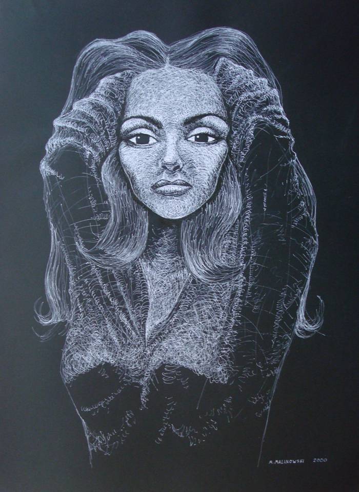 2000r.Obraz malowany na czarnym papierze,rysunek piórkiem,białym tuszem Obraz nieobramowany Obraz podpisany na odwrocie