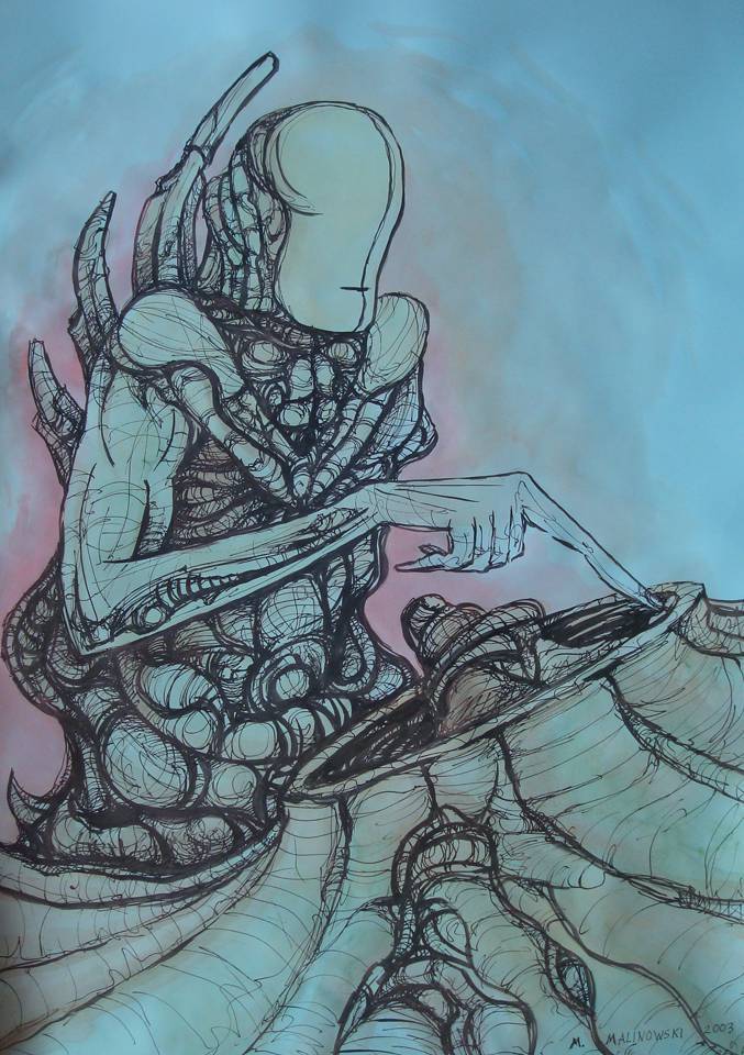 2003r.Obraz malowany na papierze,rysunek tuszem,rapidografem Obraz nieobramowany Obraz podpisany na odwrocie