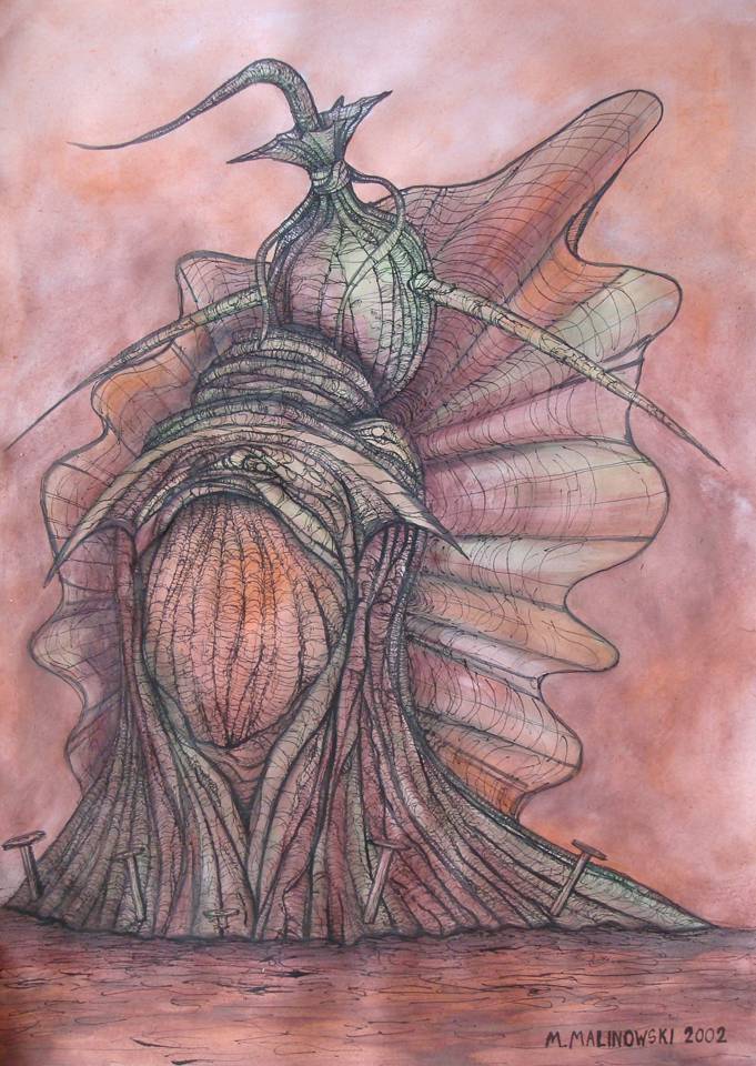 2002r.Obraz malowany na papierze,rysunek akwarelą i rapidografem Obraz nieobramowany Obraz podpisany na odwrocie