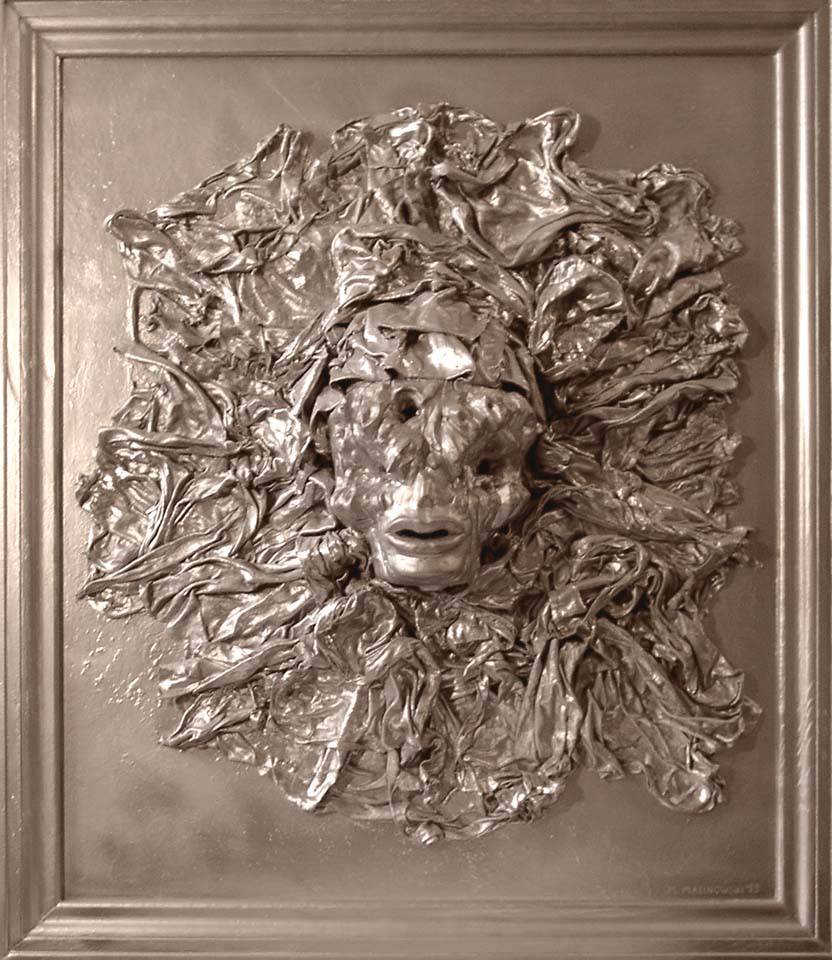 1999r.Obraz na płycie pilśniowej. Głowa wyklejona z modeliny wypełniona pianką uszczelniającą ,zmarszczki zrobione z tkaniny utwardzone lakierem samochodowym. Rama przyklejona by usztywnić obraz. Wszystko pomalowane farbą w sprayu W wymiar jest wliczona szerokość ramki. Obraz podpisany na odwrocie