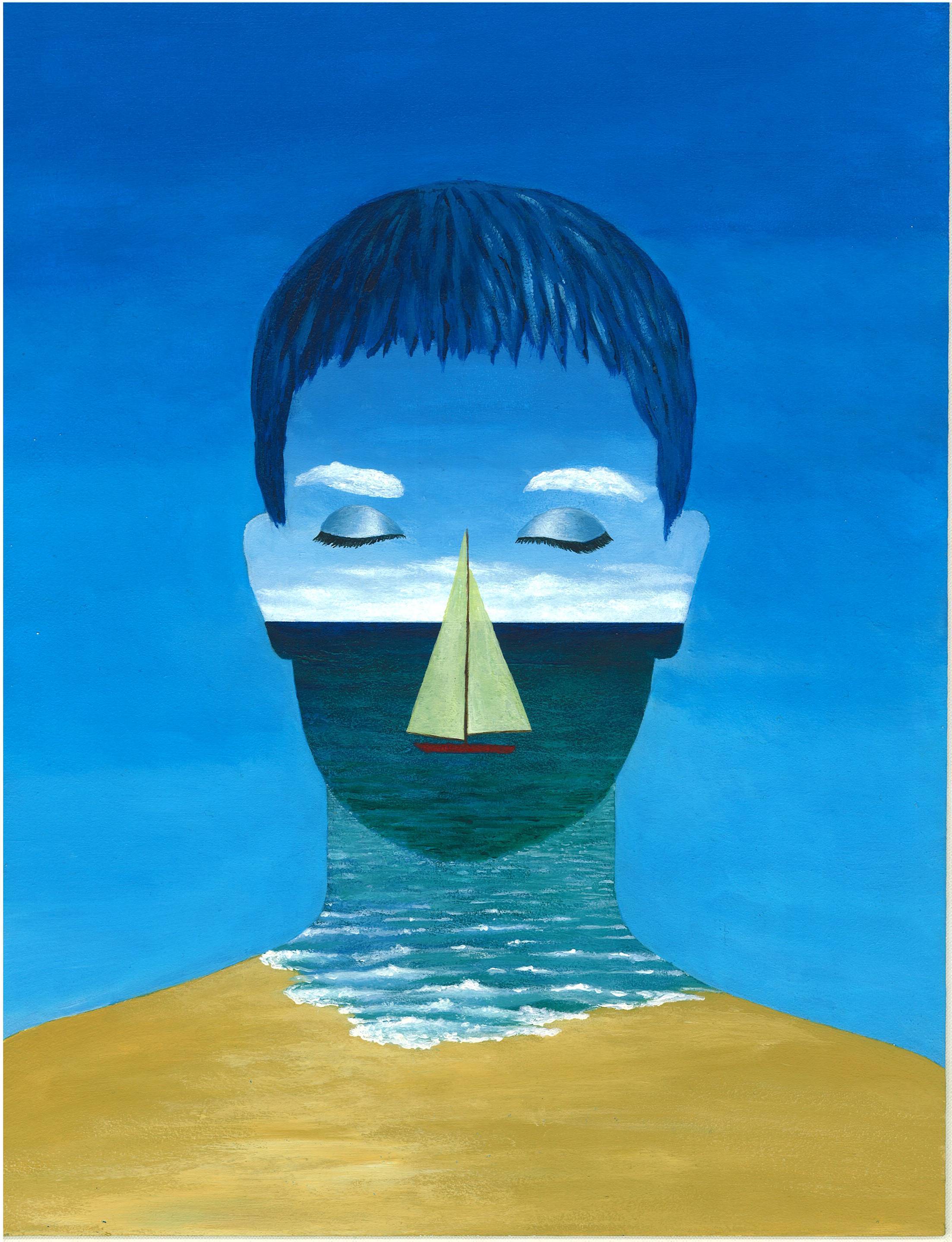 Obraz jest niezwykle intrygujący, przyciąga wzrok i zachęca do refleksji. Dominują intensywne odcienie niebieskiego, które przenikają całą kompozycję, tworząc spokojną, choć niepokojącą atmosferę. Głowa niby z nieba, a może morza, wypełniona jest wizją żaglówki sunącej po oceanie pomiędzy zamkniętymi powiekami, jakby umysł artysty dryfował gdzieś daleko. Jasne chmury unoszą się niczym myśli. Pod postacią widoczna jest plaża, to tak jakby morze wylewało się z jego wnętrza na złoty piasek. Artysta, używając techniki płaskich, ale wyrazistych kolorów, tworzy nastrój snu, gdzie rzeczywistość miesza się z wyobraźnią. To trochę tak, jakbyśmy wszyscy mieli w sobie mały świat pełen niespodzianek i odkryć, gdzie żaglówki płyną po naszych myślach. Może to symbol nieskończoności ludzkiej wyobraźni? Albo ucieczki od codzienności. Obraz sprawia, że czujemy nutkę nostalgii i tęsknoty za przestrzeniami pełnymi spokoju. No i jest też coś bardzo "cool" w tej iluzji - niby surrealizm, a jednak blisko. Dzieciak mógłby powiedzieć: hej, ja też mam w głowie całe morze! Kto nie pragnąłby takiego spokoju w głowie? Obraz ten jest prawdziwym window to the soul, odkrywający wewnętrzne podróże, które każdy z nas przeżywa w zaciszu swoich myśli. W tej prostocie, ale i głębi, obraz rzuca wyzwanie naszym interpretacjom rzeczywistości.