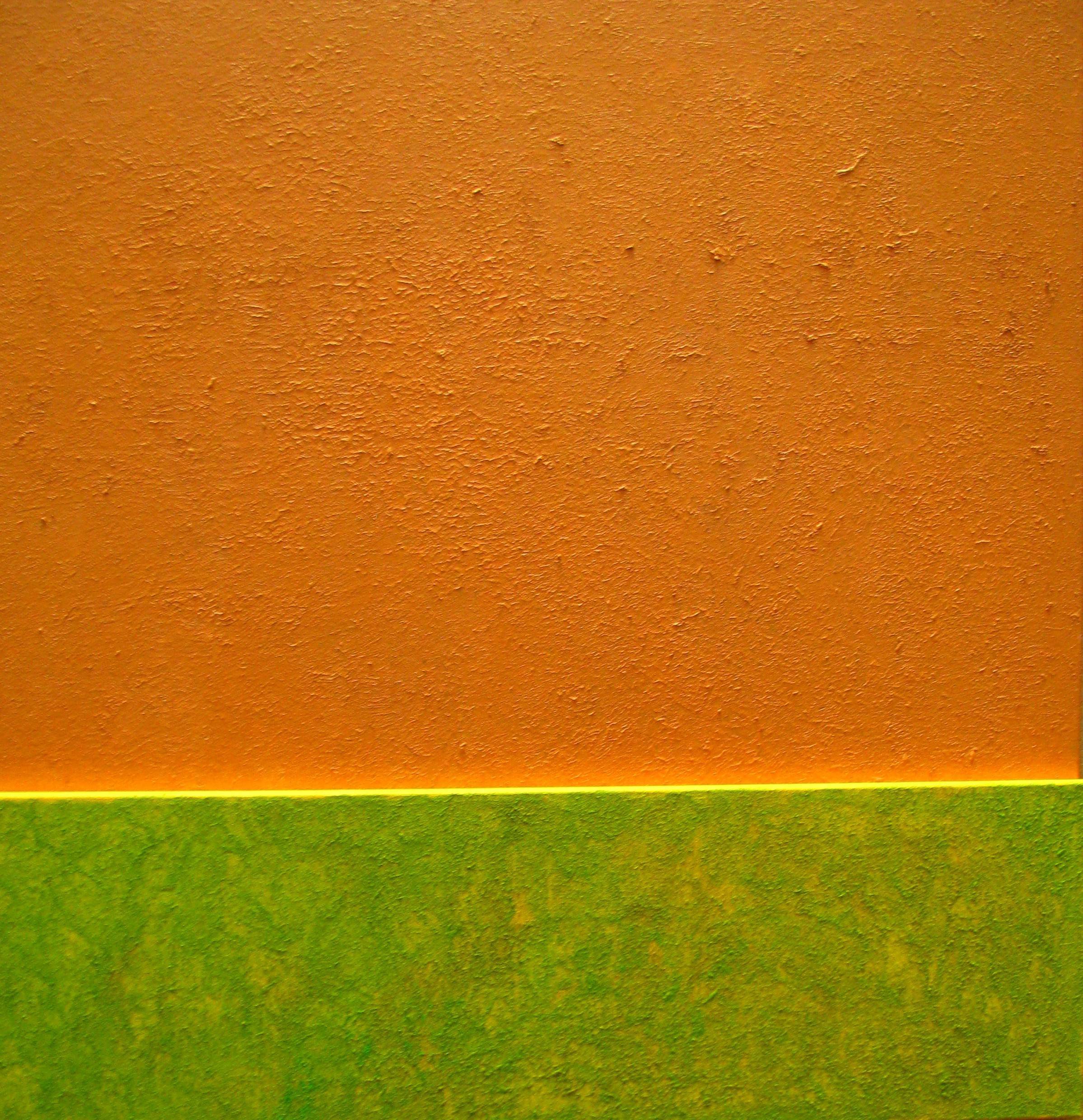 Na obrazie widzimy prostą kompozycję składającą się z dwóch kontrastujących kolorów: ciepłego pomarańczowego u góry i żywej zieleni na dole. Obie płaszczyzny są od siebie oddzielone cienkim, ale niezwykle intensywnym pasem żółtego, który niczym świetlny błysk dodaje całości dynamicznego charakteru. Ta prostota formy, choć na pierwszy rzut oka może wydawać się banalna, przyciąga wzrok i wzbudza ciekawość. Artysta z powodzeniem bawi się tutaj fakturą, bo powierzchnie są zarysowane delikatnymi wypukłościami, co dodaje im głębi. Atmosfera, jaką emanuje to dzieło, jest pełna ciszy i spokoju, ale i pewnej niewypowiedzianej energii. Wydaje się jakby kolory chciały powiedzieć coś ważnego. No i patrząc na to, łatwo jest poczuć się jak po środku pola, gdzie trawa dotyka nieba. W stylu minimalistycznym, artysta użył tu kontrastu i faktury, uwypuklając emocjonalne oddziaływanie koloru. Pomarańczowy przypomina o ciepłych letnich dniach, a zieleń obiecuje spokój i kontakt z naturą. Czuć tu freedom, jakby artysta pozwolił kolorom i kształtom mówić same za siebie. Całość jest urzekająca, choć minimalistyczna, wywołuje zadumę i sprawia, że chcemy na chwilę zatrzymać czas.