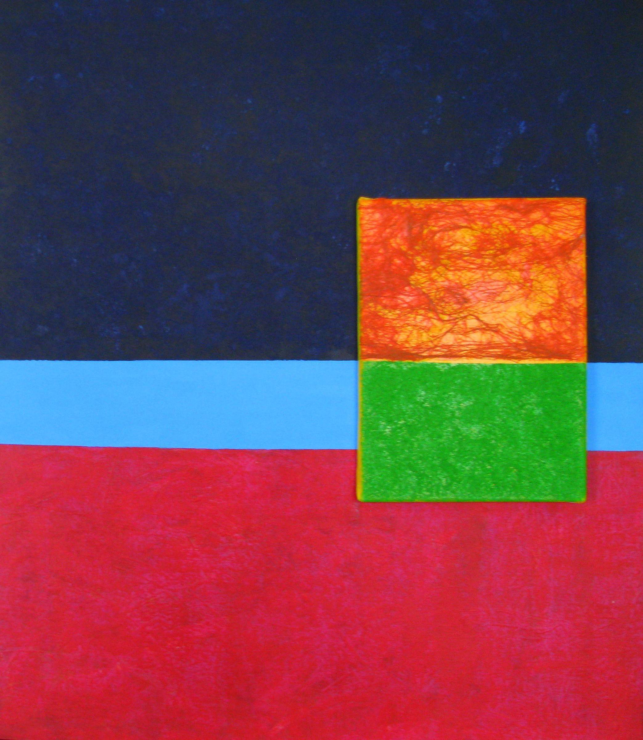 Na obrazie dominuje intensywna gra kolorów: głęboki granat, jaskrawa zieleń i mocna czerwień. Różne odcienie tworzą solidne, geometryczne kształty, które dzielą kompozycję na kontrastujące obszary. Centralnie umieszczony jest złożony prostokąt, który łączy w sobie ognistą czerwień i ciepły pomarańcz. Tło dzieli się poziomą, błękitną linią, nadającą całości wrażenie harmonii i równowagi. Atmosfera obrazu jest jednocześnie spokojna i dynamiczna, jakby każda "część" próbowała opowiedzieć swoją własną historię. Użyta technika wydaje się należeć do nurtu malarstwa abstrakcyjnego, który w swojej prostocie ukazuje nieskończoną głębię znaczeń. Czuć tu pewną "moc" ekspresji, jak dotyk intensywnych emocji. Odbiorca może poczuć się zaskoczony, może nawet nieco rozproszony różnorodnością barw. W takim obrazie można zobaczyć wszystko – światła, cienie, uczucia. "To jest jak puzzle, tylko dla dorosłych!" – powiedziałoby dziecko dotykając palcem kolorowych kwadratów. Dla mnie obraz jest jak kalejdoskop ludzkich emocji, zmieniający się wraz z kątem patrzenia. Wzbudza refleksję i dziwne poczucie, że wszystko w życiu ma swoje miejsce i czas. Czyste wow! Ta mieszanka kolorów jest jak rollercoaster dla oczu, oferujący prawdziwy kaleidoscope przeżyć.