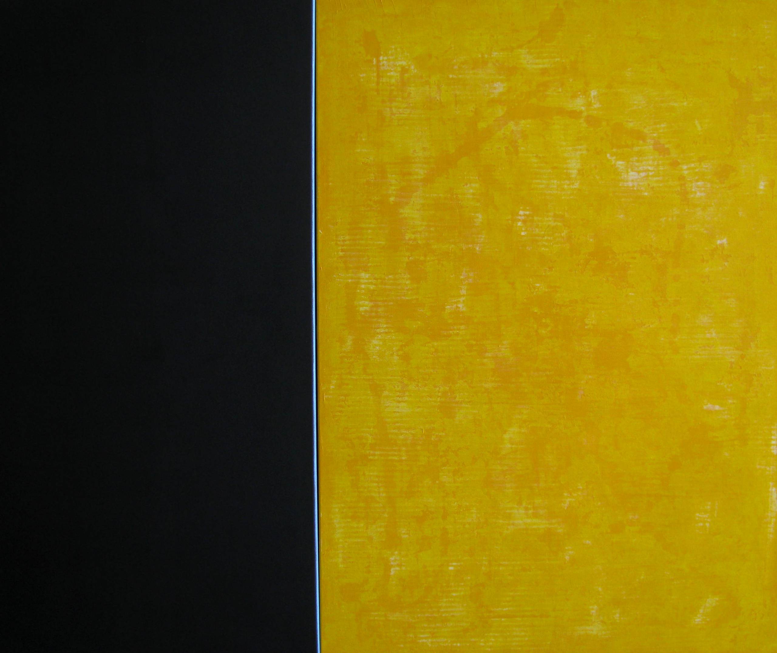 Na tym obrazie widzimy intrygujące zestawienie dwóch kontrastujących kolorów: głębokiej czerni i intensywnej żółci. Kompozycja jest prostolinijna, pionowy podział na pół tworzy wyraźną granicę między tymi barwami. Czarny, jak nieskończona przestrzeń, przyciąga wzrok swoją tajemnicą. Żółć z kolei promienieje energią, jakby chciała powiedzieć "hej, tu jestem!". Ta śmiałość i prostota sprawiają, że obraz emanuje spokojem, ale też pewnym napięciem. Może trochę abstrakcyjny, ale przecież w tym tkwi jego urok. Artysta użył oszczędnych środków wyrazu, co podkreśla minimalistyczny styl obrazu. Warstwy żółci są delikatnie teksturowane, dodając pracy subtelności. Czernie są głęboko nasycone, niemal jakby wciągały w siebie światło. Technika może zdawać się prosta, ale wymagała precyzji – to właśnie "less is more". Wzbudza to w nas refleksje o dualizmie życia, o równowadze między światłem a ciemnością. Obraz wpływa na widza, prowokując emocje i myśli. Przypomina mi sunnny dzień na tle nocnego nieba. Ta kompozycja może wywołać poczucie spokoju, ale i lekkiego niepokoju – co czai się w tej czerni? A może to po prostu gra jasności i mroku, jak ten starry night. Może być też o byciu innym, żółtym wśród czarnych. Kto wie? Każdy widzi coś innego, i to jest tu piękne.
