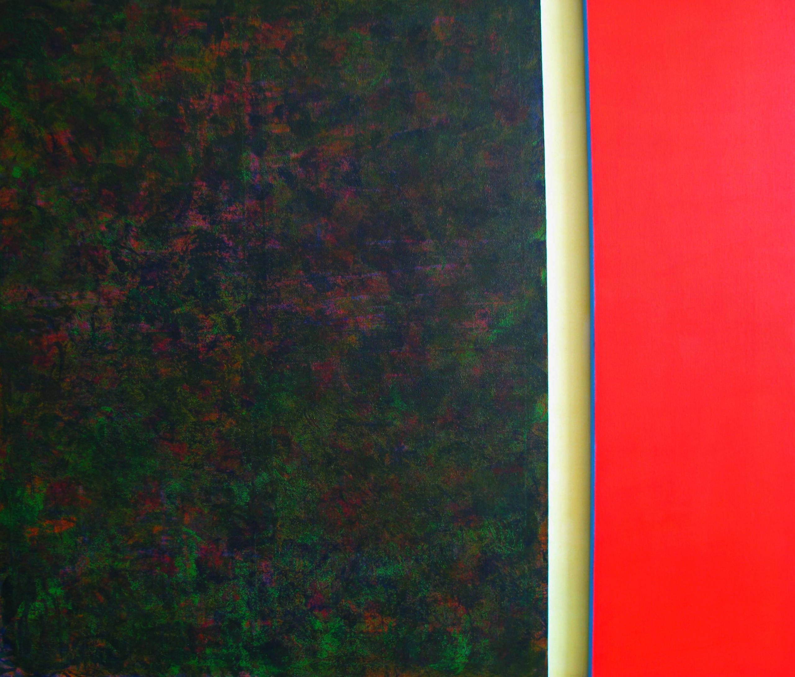 Na obrazie dominują dwa kontrastujące ze sobą kolory: głęboki, ciemny odcień zieleni po lewej i intensywna czerwień po prawej. Między nimi przejawia się wąski, jasny pasek, który tworzy dynamiczną granicę i nadaje kompozycji równowagi. Zielona część przypomina tajemniczy las, pełen ukrytych detali, zasłaniających się pod warstwami barw – niemal można poczuć zapach mchu. Czerwień z kolei jest czysta, zdecydowana, jakby chciała powiedzieć "I'm here!", przyciąga wzrok i nie pozwala zapomnieć o swojej obecności. Nastrój dzieła balansuje między tajemniczością a energią, wzbudzając ciekawość. Artysta zastosował technikę impastową, nadając fakturze głębi, co jeszcze bardziej potęguje wrażenie ruchu i życia. Obraz emanuje emocjami, zmuszając do refleksji: co znajduje się za tą czerwoną zasłoną? Czy ciemność kryje w sobie coś nieznanego? 7-letnie dziecko mogłoby powiedzieć: "Ten obraz jest jak bajka, co się śni w kolorach!". Każde spojrzenie na to dzieło może wywołać inne myśli, budząc u widza skojarzenia z życiowym kontrastem między spokojem a chaosem. Delektowanie się tym widowiskiem jest jak wertowanie kart książki pełnej emocji.