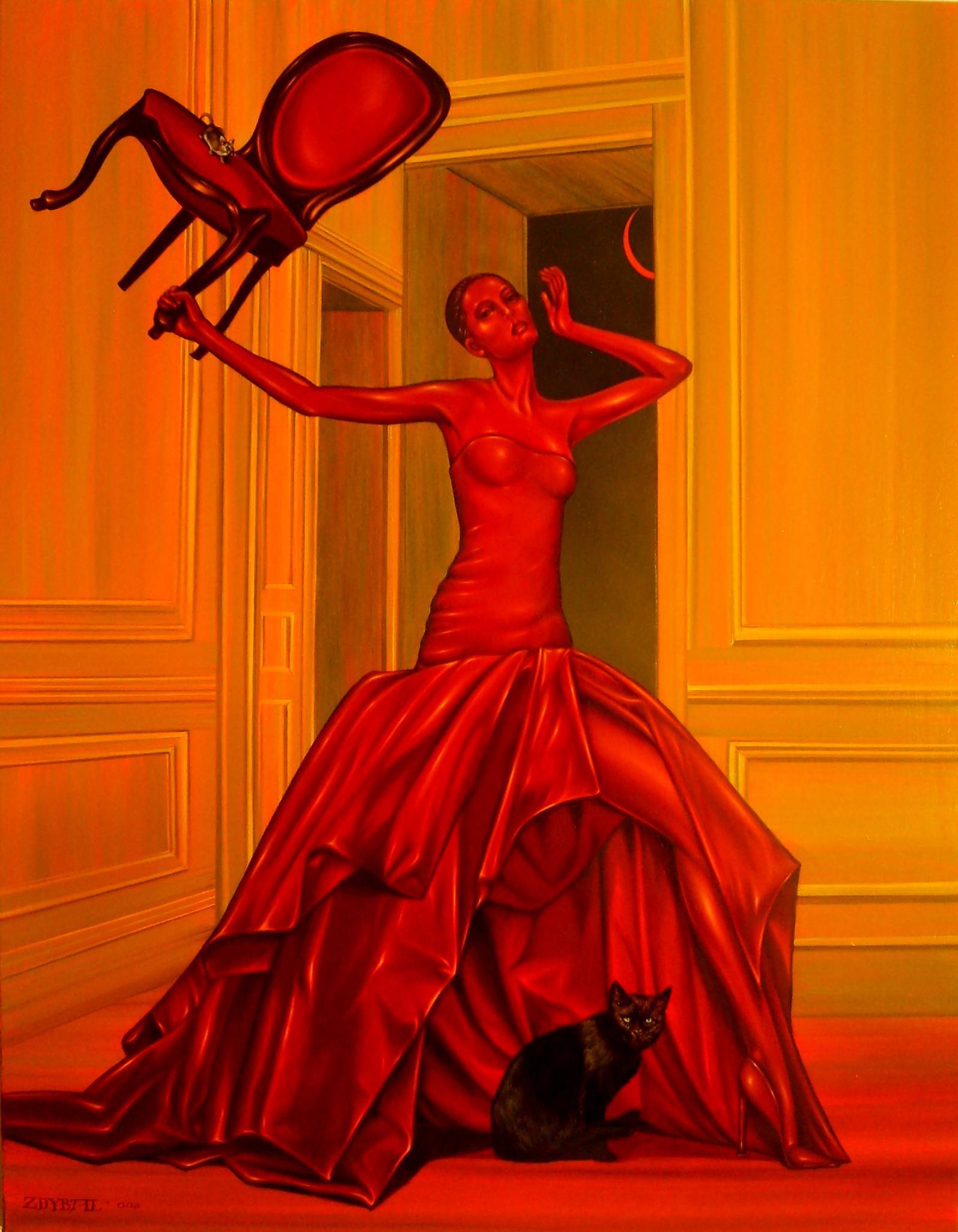 Na obrazie przeważa ciepła paleta kolorów, głównie intensywna czerwień przechodząca w odcienie pomarańczy i żółci. Postać kobiety jest centralnym punktem kompozycji, przykuwa wzrok swoją niecodzienną pozą i imponującą suknią przypominającą falującą tkaninę. W ręku trzyma krzesło, jakby była gotowa do teatralnego występu lub decydującej akcji. Obok niej przemyka czarny kot, dodający intrygi i tajemniczości do całej sceny. Całość emanuje aurą surrealizmu, jakbyśmy patrzyli na sen. Styl artystyczny obrazu łączy w sobie realizm z elementami onirycznymi, co sprawia, że odbiorca czuje się wciągnięty w niezwykłą opowieść. Technika malarska podkreśla detale materiału sukni, nadając jej niemal rzeźbiarską formę. Czujemy napięcie i dynamikę sceny, jakby coś miało się zaraz wydarzyć. Mały kotek patrzy na mnie, ale nie wiem czego chce. Może jest głodny? Obraz wywołuje emocje niepokoju i fascynacji, a może nawet daje ciarki. Patrząc na niego, można się zastanawiać nad symboliką poszczególnych elementów. Co oznacza krzesło? Może to freedom, symbol wolności lub siły, a może coś całkiem innego. Każdy dostrzeże tu coś dla siebie, a interpretacji może być wiele. Ta mieszanka formalizmu i swobody w stylu to prawdziwa uczta dla zmysłów i umysłu. To dzieło, które można odkrywać i smakować bez końca.