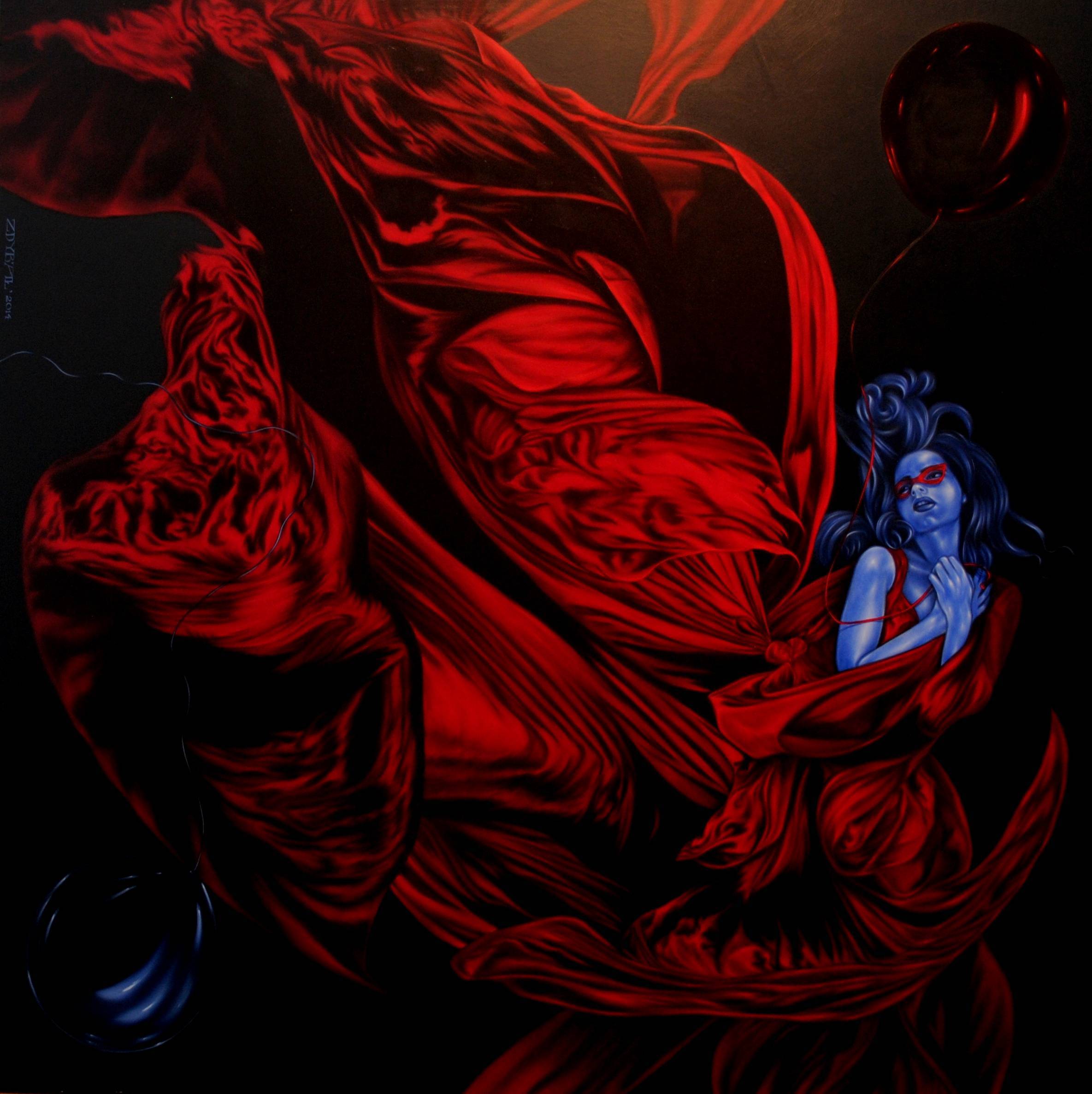 Na obrazie dominuje intensywny kontrast między głęboką czerwienią a ciemną czernią tła. Czerwone fale tkaniny zdają się unosic w powietrzu, tworząc dynamiczne linie i krzywizny, które przyciągają wzrok. Postać o niebieskiej, niemal eterycznej skórze i czerwonych oczach wywołuje uczucie tajemnicy i nieco niepokoju. Atmosfera jest dramatyczna, jak scena z koszmaru lub baśni, gdzie każda sekunda jest pełna napięcia. Artysta zastosował śmiałe pociągnięcia pędzla, tworząc tekstury, które niemal można dotknąć. Styl jest surrealistyczny, a może nawet trochę futurystyczny. Emocje? Hm, budzi to we mnie poczucie chaosu i dzikości, jakby obraz mówił: "Leap of faith". Patrzę na to i myślę, co ja bym zrobił w takiej sytuacji. Może to symbolka walki z wewnętrznymi demonami? 7-letnie dziecko powie: "Wow, ta pani ma bladą skórę jak lody!" Zdecydowanie angażuje i sprawia, że zatrzymujesz się na dłużej, żeby zrozumieć, co naprawdę się dzieje na tym płótnie. Fascynujący.
