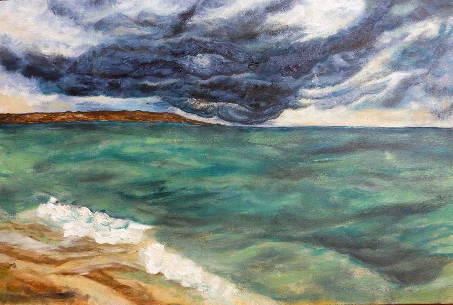 Rozm. 40 x 60. Płótno, olej. Obraz malowany techniką mieszaną… - pędzelkami i szpachelką. Przedstawia zachmurzone niebo tuż przed burzą nad Półwyspem Kazantyp położonym nad Morzem Azowskim. Na obrazie widać z oddali półwysep. 2011