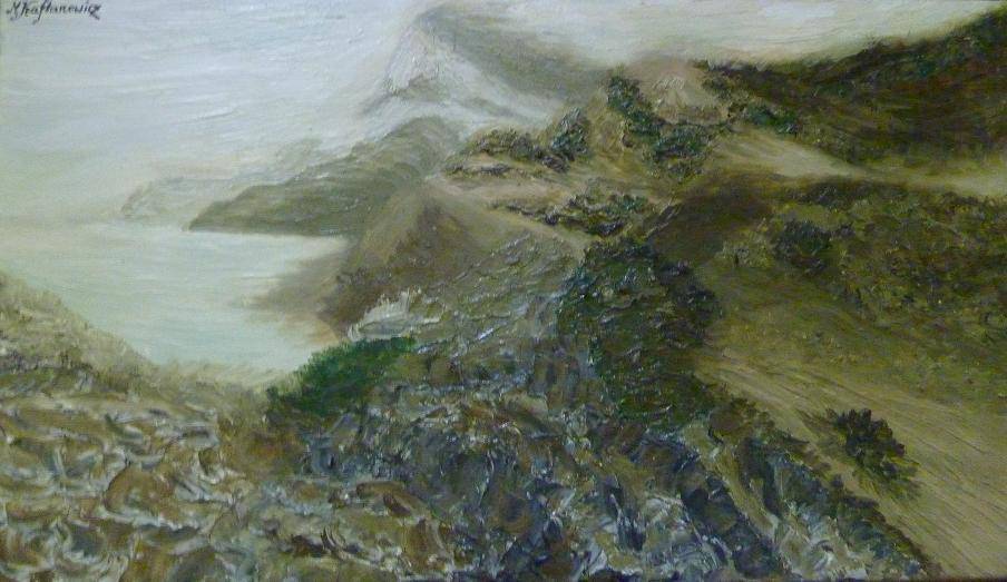 Rozm. 40 x 70 cm. Obraz olejny malowany szpachelkami. Grubo nakładana farba. Obraz ma "chropowatą" fakturę. Przedstawia górską panoramę w miejscowości Sudak na Krymie. 2010 rok. Nie posiadam już tego konkretnego obrazu, ale w związku z zainteresowaniem informuję, że na specjalne zamówienie namaluję podobny. Proszę o skorzystanie z opcji "cena na maila".