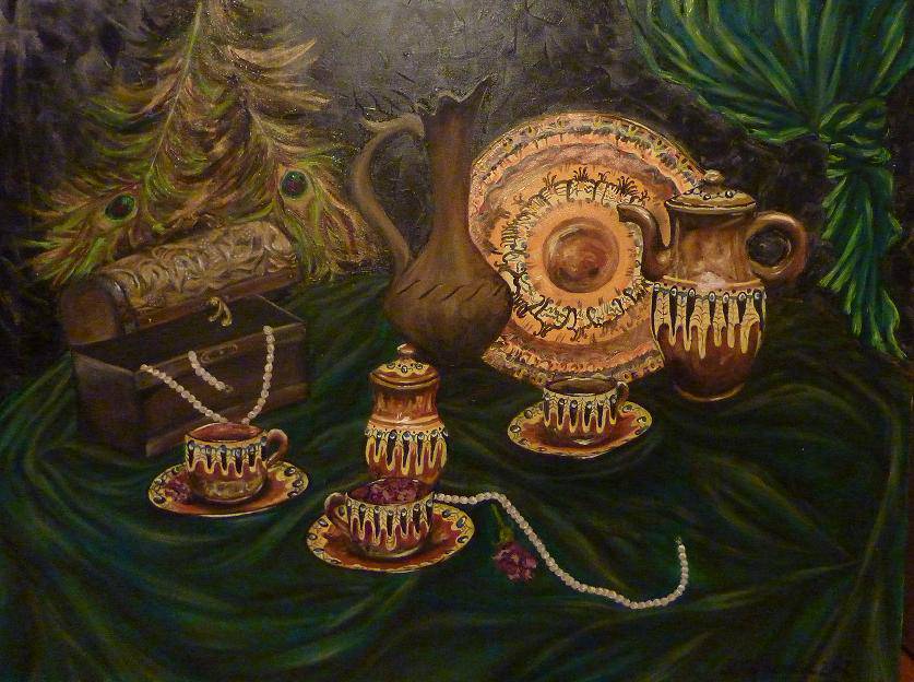 80 x 100 cm. Płótno, olej oraz pigmenty sypkie (ziemne i metaliczne) 2012 rok; Wspólnym elementem wszystkich krymskich martwych natur będą przedmioty stamtąd przywiezione. W tym przypadku kuferek, perły, gliniany dzbanek i pawie oczka. Do tych przedmiotów najbardziej pasował mi prześliczny serwis, który podobno ma 35 lat, a wciąż wygląda pięknie.