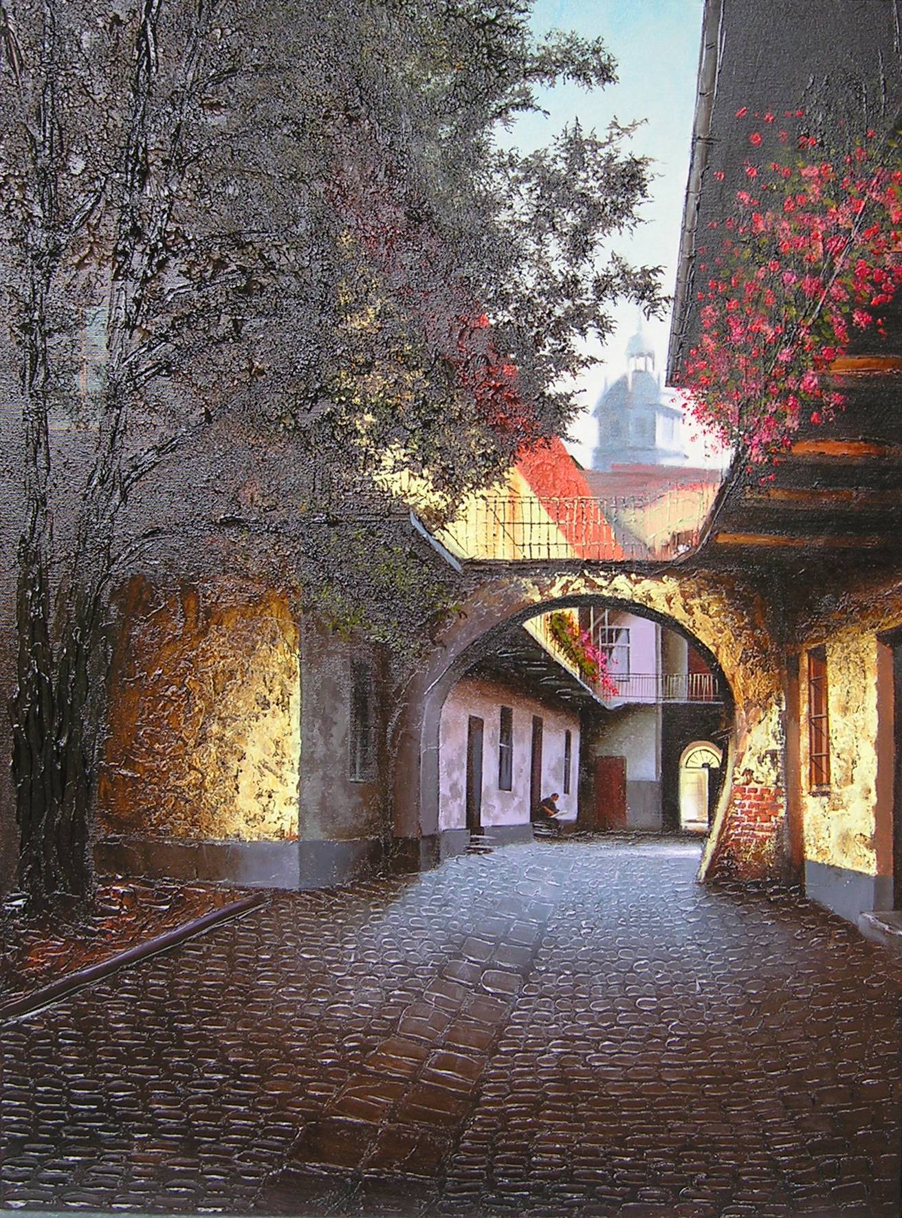 Obraz ukazuje urokliwy, brukowany dziedziniec skąpany w ciepłym świetle. Smagane słońcem ściany mają przyjemny, złocisty odcień, odbijając promienie i tworząc grę światła i cienia. Po lewej, smukłe drzewo dodaje kompozycji naturalnego akcentu, a jego bladozielone liście delikatnie kontrastują z żywymi czerwonymi kwiatami po prawej stronie. Kompozycja prowadzi wzrok wzdłuż krętej ścieżki, ku łukowi, który otwiera widok na dalsze budynki i wieżę kościoła w tle. Nastrój dzieła jest nostalgiczny i spokojny. Czujemy jakbyśmy przenieśli się w czasie, do świata pełnego ciepła i spokoju. W tym miejscu słychać echo dawnych rozmów i śmiechu. Artysta zastosował delikatny impast, co nadaje fakturze niezwykłej głębi, a użycie subtle cieniowania sprawia, że to miejsce wydaje się niemal dotykalne. Każdy detal malowany jest z precyzją, ale też miłością do tematu. Obraz wywołuje tęsknotę za prostotą dawnych dni. Patrząc na niego, niemal czuje się zapach świeżych kwiatów i chłodny powiew wiatru. Czy to nie cudowne, jak sztuka potrafi przenosić nas w inne miejsca? Może być też dziecku przypominać wakacje u dziadków, w miejscu gdzie czas zwalnia. Keep exploring takie magiczne zakątki, bo w nich tkwi siła wspomnień.