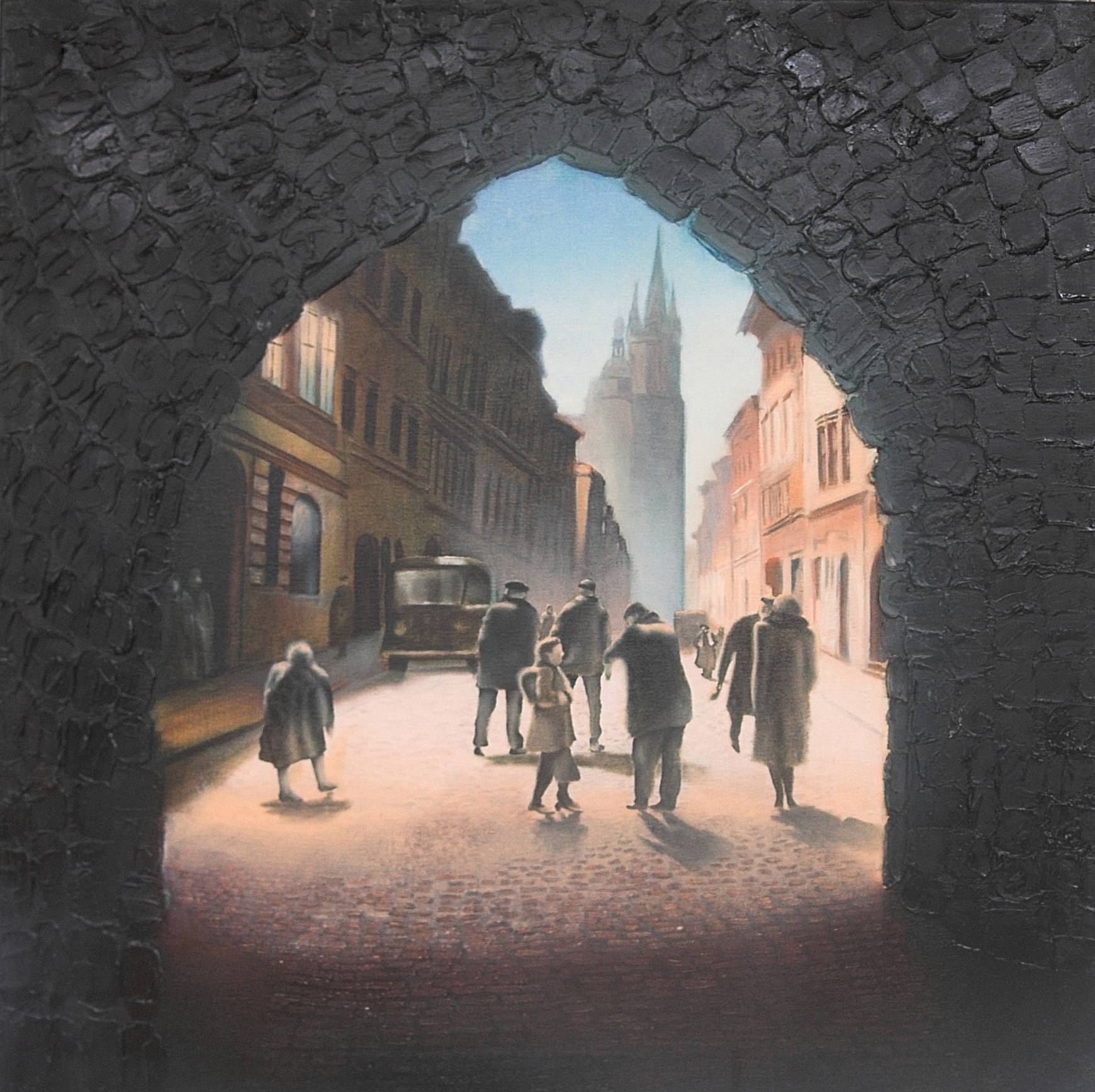 Obraz przedstawia scenę miejską widzianą przez łuk z kamieni, co nadaje mu klimatyczny charakter. W tle ciągną się rzędy kamienic, tworzące długą ulicę. Ich ciepłe barwy, beże i brązy, kontrastują z niebieskim niebem rozmytym od lekkiej mgły. Centralnym punktem jest wieża kościelna, wznosząca się majestatycznie. Ludzie przechadzający się ulicą, ubrani w ciemne płaszcze, wyglądają jakby byli wyciągnięci z innej epoki, miejscami zacierają się w materiale miejskiej scenerii. Atmosfera obrazu jest nieco tajemnicza, ale też nostalgiczna. Jest jak powrót do przeszłości, kiedy jeszcze wszystko wydawało się prostsze. Technika użyta przez artystę to zapewne olej na płótnie; miękkie pociągnięcia pędzla nadają obrazowi płynność i głębię. Czyż całość nie przypomina pięknej starej fotografii, której nie chce się schować do szuflady? Patrząc na ten obraz, można poczuć spokój zmieszany z lekkim smutkiem. Gdzie ci ludzie idą? Co, a może kogo, tam szukają? Dziecko mogłoby zapytać: "A dokąd oni poszli?" – i właśnie to pytanie zostaje z nami na dłużej. Całość emanuje pewnym urokiem, a klimat starego miasta dodaje magicznego touch, którego nie sposób opisać słowami. To jedno z tych dzieł, które przypominają nam, jak ważne są chwile uchwycone w czasie.