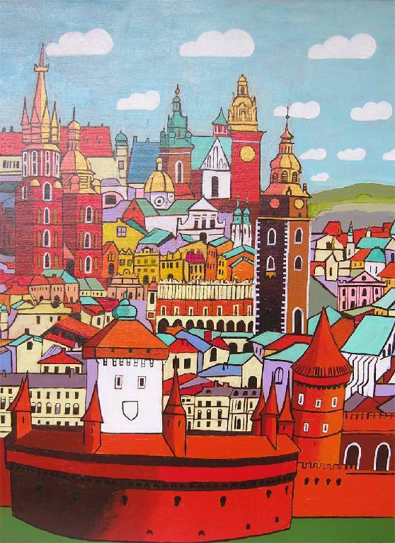 Obraz przedstawia kolorowe miasteczko, gdzie każda wieżyczka i budynek zdaje się przyciągać wzrok niczym magnes. Dominują żywe barwy – intensywne czerwienie, błękity oraz zielenie. Kompozycja to istny kalejdoskop form i kształtów; budynki ciasno przylegają do siebie, tworząc niemal labirynt pełen detali. Atmosfera? Bez wątpienia radosna i beztroska, coś jakby fiestę na miejskim targu. Technika artystyczna sięga po wyraziste kontury i niemal płaskie plamy koloru, przypominając styl fowistyczny. Obraz budzi w odbiorcy ciekawość świata towarzyszącą dziecięcej wyobraźni. Ktoś mógłby spędzić godziny, snując opowieści o mieszkańcach tego magicznego świata. Strukturę miasta podkreślają cieniowane dachy, a niebo z delikatnymi chmurkami dodaje całości spokoju. Och, jak ja bym chciał tam być i poczuć ten magiczny klimat! Zaś małe dziecko mogłoby powiedzieć: te domki wyglądają jak z bajki! Jeden element tej kompozycji mówi jednak – jest magicznie, ale czujesz też spokój, got it?