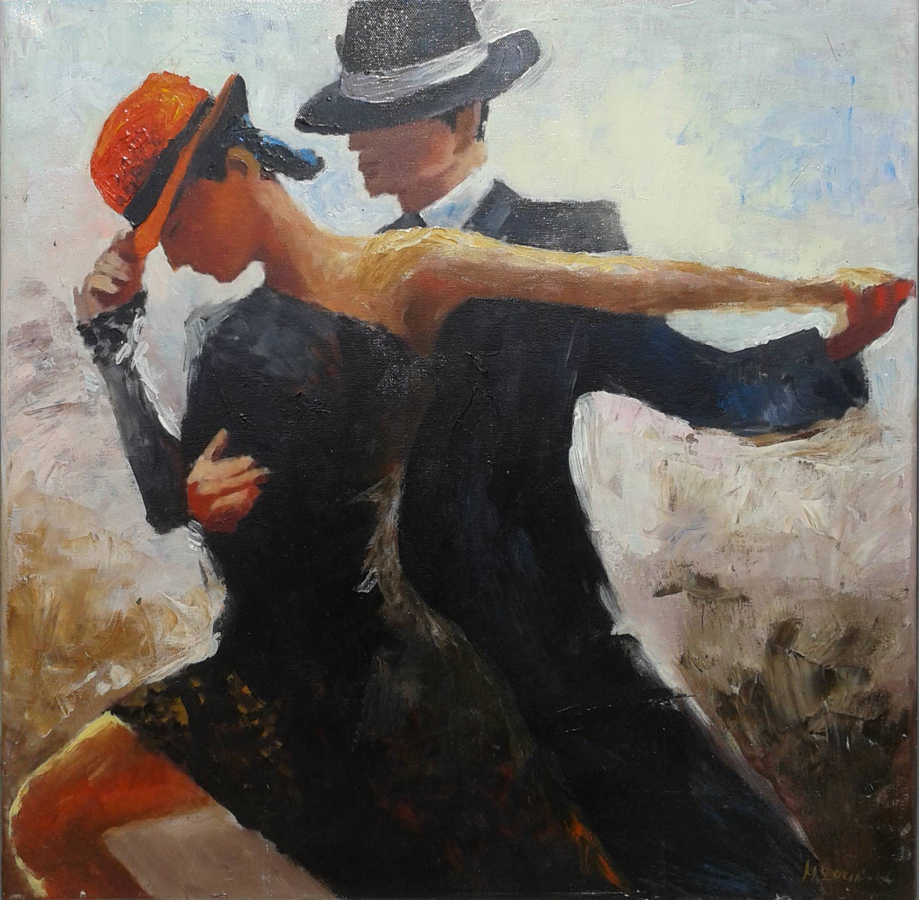 Na obrazie widzimy parę w tańcu, w doskonałej harmonii i ekspresji. Kolory są intensywne, dominują czerń, szarości i czerwienie, które tworzą dynamiczny kontrast. Tancerze są ubrani elegancko, z kapeluszami na głowach, co dodaje im charakteru i pewnej tajemniczości. Kompozycja jest pełna ruchu, a maźnięcia pędzla oddają dynamikę ich ruchów. Atmosfera obrazu jest pełna pasji i emocji. Taniec wydaje się być niesamowicie emocjonującą chwilą, zatrzymaną na płótnie. Styl artystyczny przypomina impresjonizm, gdzie rozmyte kontury postaci i żywe kolory dominują nad szczegółowością przedstawienia. Technika użyta przez artystę pozwala na oddanie energii i emocji. To dzieło może wywoływać w widzu uczucie nostalgii za dawnymi czasami, kiedy taniec był formą sztuki i wyrazu uczuć. Mnie osobiście obraz ten przenosi w świat, w którym tango jest królem nocy. Jej kuk kapelusza jest jakby szeptem obietnicy, a ruchy mężczyzny - pewne i stanowcze. Po prostu wow. Jakby te kolory same tańczyły na płótnie. Obraz wręcz krzyczy „passion” i zaprasza do głębszego zanurzenia się w jego świat.