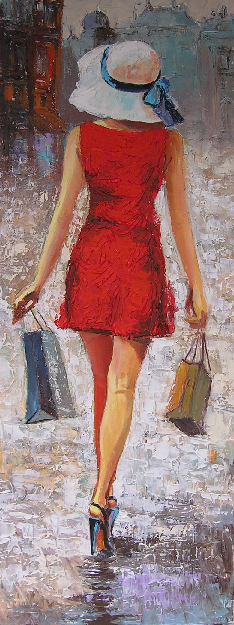 Obraz ukazuje postać kobiety w czerwonej sukience, której intensywna barwa przyciąga wzrok od razu. Białe, krągłe kapelusze z niebieską wstążką biją w oczy elegancją. Tło jest niejednoznaczne, przypominające rozmyte ulice, jakby zaraz miał spaść deszcz. Atmosfera dzieła to połączenie nostalgii i beztroski. Widać tu grube pociągnięcia pędzla, co sugeruje użycie techniki impasto. To robi obraz taki, jakby artysta chciał uchwycić chwilę z życia w ruchu. Kobieta niesie torby, jakby właśnie wyszła z udanych zakupów. Czy czuje się szczęśliwa? Pewnie tak. Możemy wyobrazić sobie hałas miasta i zgiełk, który towarzyszy tej scenie. Kolorystycznie dzieło jest harmonijne, choć kontrastowe. Emocje? No cóż, obraz wywołuje we mnie tęsknotę za spacerem po ulicach miasta. Dziecko powie: "Ona pewnie idzie do domu po zakupy". Myślę, że to poczucie ruchu, tej chwili "in-between", jest naprawdę magiczne. Tekstura malowidła jest naprawdę engaging. Niby zwykła scena, a jednak wzbudza tyle refleksji, prawda?