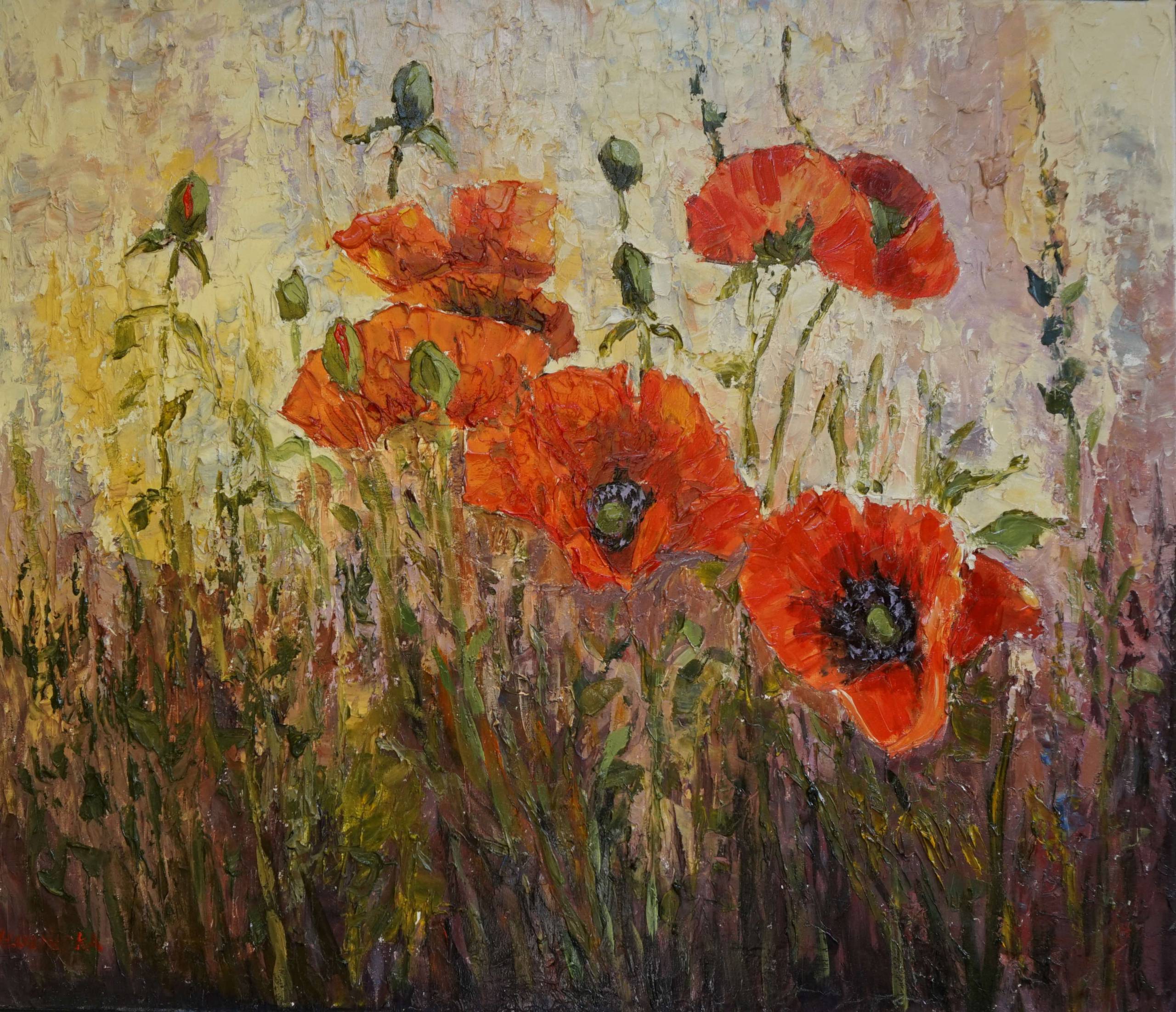 Obraz namalowany farbą olejną na płótnie.Widoczna jest faktura farby nakładanej szpachelką.