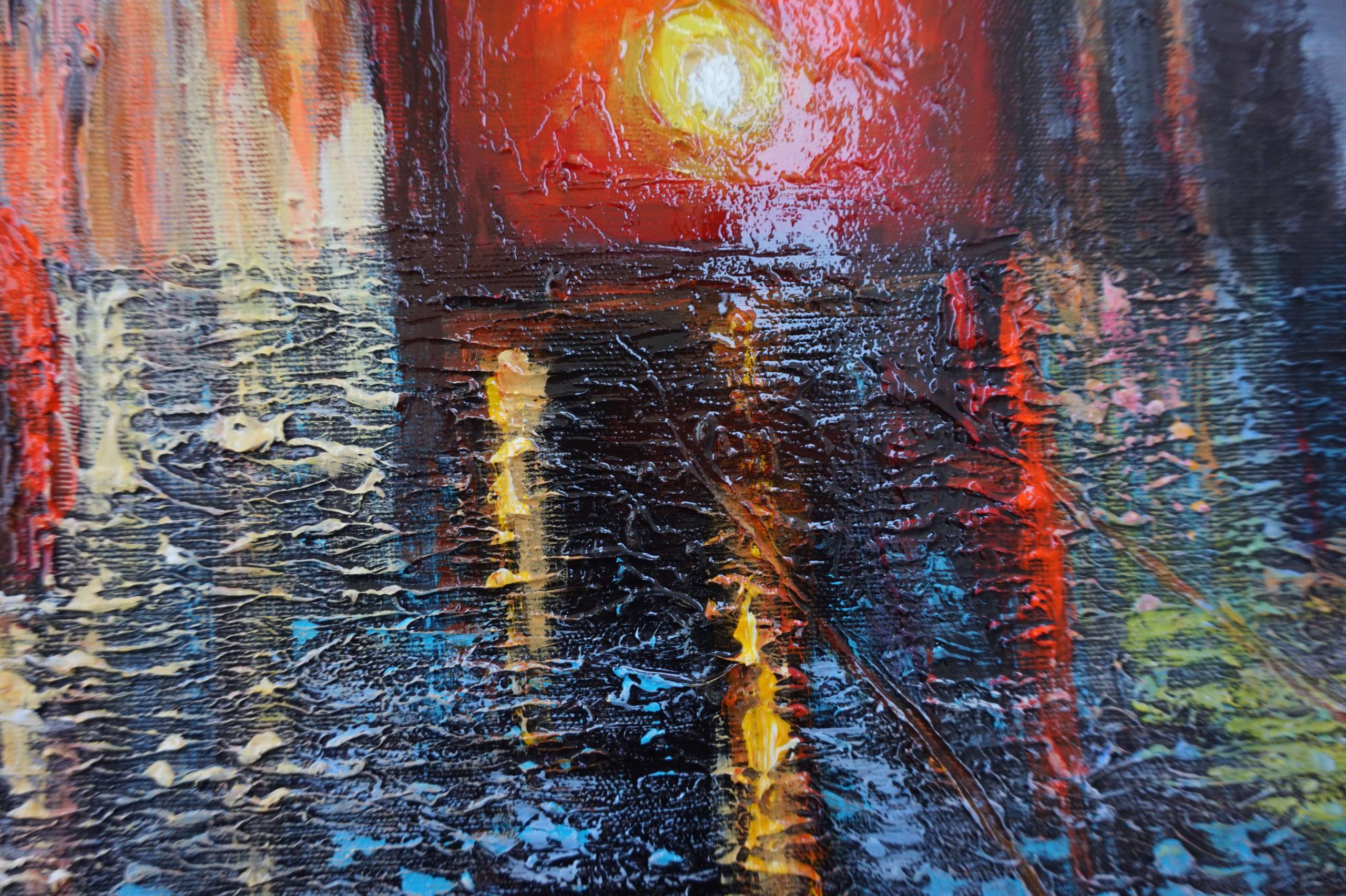 Obraz jest nasycony kolorami i emocjami. W centrum widzimy czerwony tramwaj, który lśni w deszczowej wilgoci ulic. Jego intensywny kolor kontrastuje z chłodnymi odcieniami niebieskiego i szarości, które dominują w tle. Para ludzi pod parasolem idzie w stronę tramwaju, ich sylwetki miękko zarysowane, jakby trochę rozmyte przez deszcz. Wszystko jest tu trochę magiczne i nostalgiczne. Ten klimat przypomina mi jesienne dni, kiedy krople deszczu tworzą taniec na chodniku. Artyście udało się oddać ulotny moment za pomocą impastu, co nadaje faktury całej kompozycji. Obraz emanuje melancholią, jakby mówił o chwilach zamyślenia i wspomnień. Czujemy spokój, lecz i odrobinę smutku. Nasiąka on refleksyjnym nastrojem, typowym dla takich miejskich scen. Technika jest ekspresyjna, z wyraźnym użyciem pędzla, który zdaje się tańczyć po płótnie. To bardzo "żywe" przedstawienie, czujesz się jakbyś tam był, słysząc szum kół tramwaju. Może ten obraz wywoływać w odbiorcy poczucie ciepła, mimo mokrego otoczenia. Dla mnie to widok wieczornej przechadzki z kimś bliskim, z kim można dzielić parasol i sekrety. Takie obrazy przypominają mi, że nawet w szarości są chwile koloru i blasku. Jest to wręcz "heartwarming" scena, która za jednym spojrzeniem potrafi opowiedzieć całą historię. Wiesz, mam nadzieję, że im się nie zmokły nogi!