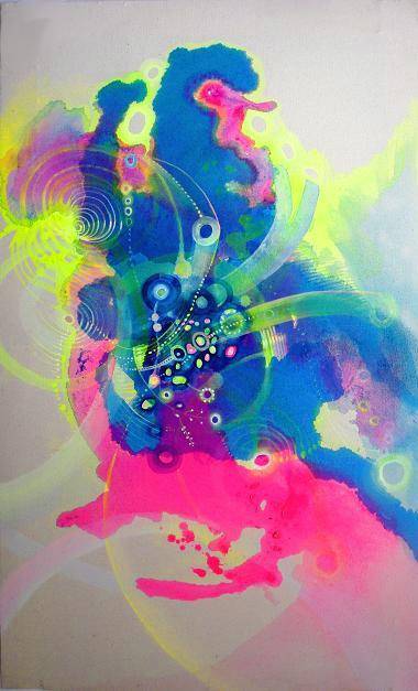 Obraz ten jest eksplozją kolorów, które tańczą przed naszymi oczami. Neonowe różowe, głębokie błękity i elektryzujące żółcie mieszają się, tworząc niesamowity kalejdoskop barw. Kształty są płynne, przypominają fale dźwiękowe i kosmiczne wędrówki galaktyk. Wygląda jak z kosmosu! Kompozycja jest zawiła, z centralnym punktem skupienia, ale jednak nie zawiera wyraźnych granic. Atmosfera obrazu jest niezwykle dynamiczna i żywa, emanuje energią, która pobudza zmysły. Czujemy się, jakbyśmy nurkowali w oceanie dźwięków i świateł. Artysta zastosował techniki przypominające action painting, z energicznymi pociągnięciami i chaotycznym rozmieszczeniem elementów. To dzieło można określić jako synestetyczne, wywołujące uczucie, jakby każda barwa miała swój własny dźwięk. Patrząc na obraz, czujemy radość, ekscytację, a może nawet nutkę nostalgii. Z jednej strony pozytywne wibracje, a z drugiej tajemnicza głębia, która nas pociąga. To trochę jak przystanek w podróży po wszechświecie, gdzie można odpocząć i nabrać energii. Wow, to jest super! A może tak wygląda nasz inner world, pełen nieokiełznanej kreatywności? Ten obraz z pewnością zostawia nas z pytaniem: co jeszcze kryje się za tym wirującym spektaklem kolorów?