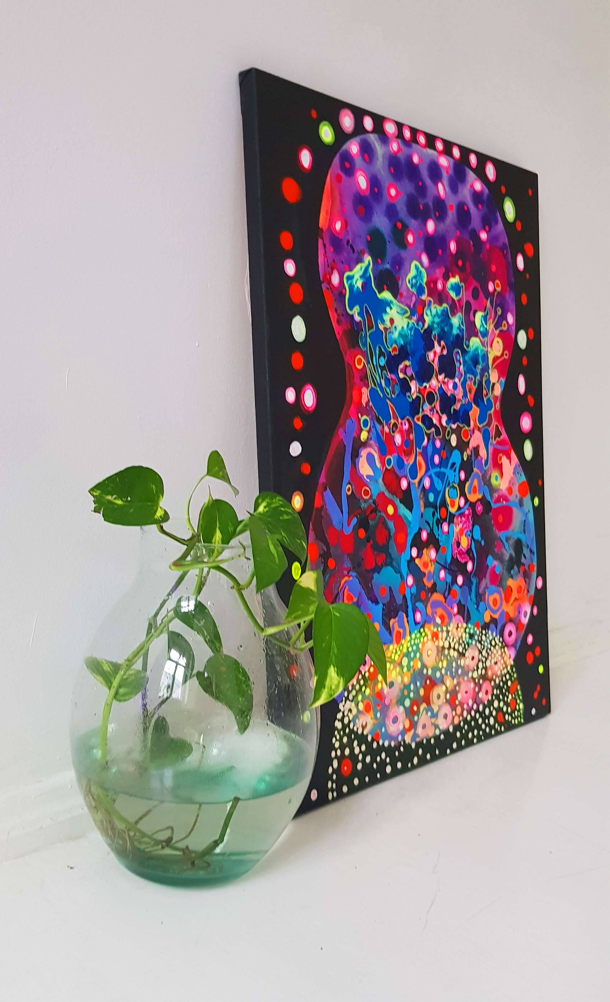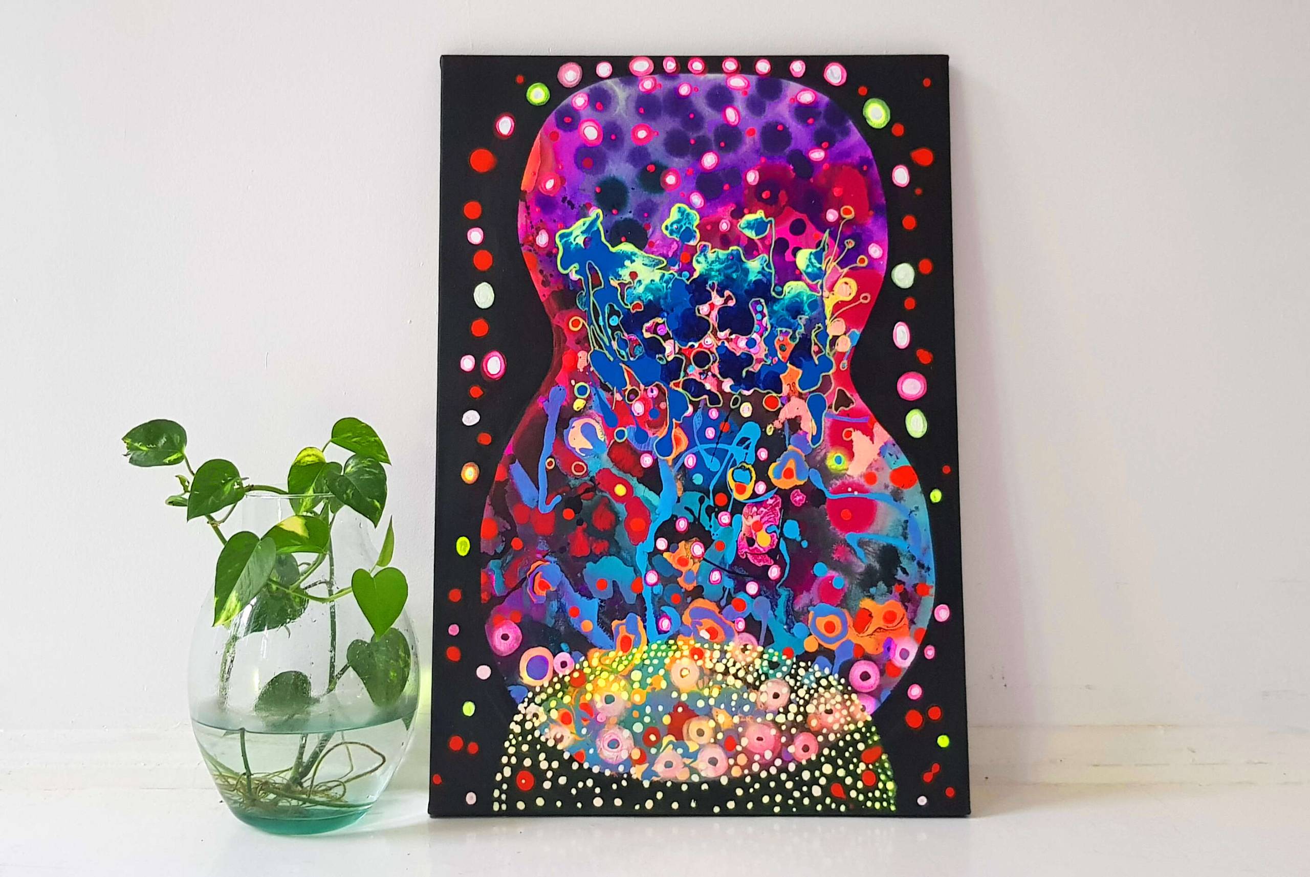 Na obrazie dominują intensywne kolory: fiolet, róż, niebieski i jaskrawa zieleń tworzą feerię barw przyciągającą wzrok. Na czarnym tle wyłaniają się abstrakcyjne kształty, jakby wyjęte z marzeń sennych czy dalekiej galaktyki. Całość kompozycji przypomina kalejdoskop, gdzie chaos i harmonia współistnieją w dynamicznym tańcu form i kolorów. Atmosfera dzieła jest wręcz magiczna, pełna energii i ekspresji, budząc poczucie tajemnicy i zapraszając do eksploracji. Styl artysty przywodzi na myśl sztukę współczesną, gdzie swoboda i spontaniczność pędzla splatają się z precyzją detali. Widać tu ślady technik użycia farb akrylowych, które tworzą żywe kontrasty i struktury, przyciągające uwagę bogactwem faktur. To jest taki obraz, na którym można zawiesić oko przez dłuższy czas, odkrywając wciąż nowe szczegóły. Patrząc na ten obraz, można poczuć się jak w innym świecie. Może to być wybuch radości, a może odrobina chaosu, taki jak w dream. A co, jeśli to jest nieskończona przestrzeń podwodnych fantazji? Dla dziecka to może być strasznie dziwne, jakby różowe chmurki tańczyły w nieznanej krainie. Małe bąbelki i okręgi przenikają się, tworząc rytm, który wciąga i zachwyca. To naprawdę niesamowite, jak obraz potrafi mówić do nas w tak różnych językach emocji, a jednocześnie pozostawiać każdemu pole do własnej interpretacji.