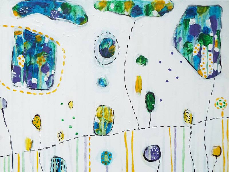 Obraz na pierwszy rzut oka przywodzi na myśl abstrakcyjne łąki pełne kolorów i kształtów. Dominują tu odcienie zieleni i niebieskiego, które przeplatają się z energetycznymi akcentami żółci i fioletu. Kształty są nieregularne, przypominające plamy lub może obłoki, które unoszą się nad białym tłem. Kompozycja wydaje się spontaniczna, niemal jakby artysta bawił się farbami, pozwalając im płynąć swobodnie. Atmosfera obrazu emanuje spokojem i radością. Czuję się jakbym obserwował dziecięcy świat fantasy, pełen pozytywnych wibracji. Techniki użyte przez artystę są luźne i swobodne. Pociągnięcia pędzla są widoczne, dając wrażenie dynamizmu i ruchu. To takie freedom, które daje poczucie lekkości. Obraz może skłaniać do refleksji nad ulotnymi chwilami szczęścia. Może przypominać chwile beztroski z dzieciństwa, kiedy to wyobraźnia nie znała granic. Mam wrażenie, że każdy widzi tu coś innego. A może to drzewka na wiosnę? Tak naprawdę, ten obraz można interpretować na wiele sposobów. Dla mnie to eksplozja kreatywności i symbol wolności. Chyba chciałbym mieć to na ścianie w salonie! Niby nic konkretnego, a jednak wywołuje uśmiech.