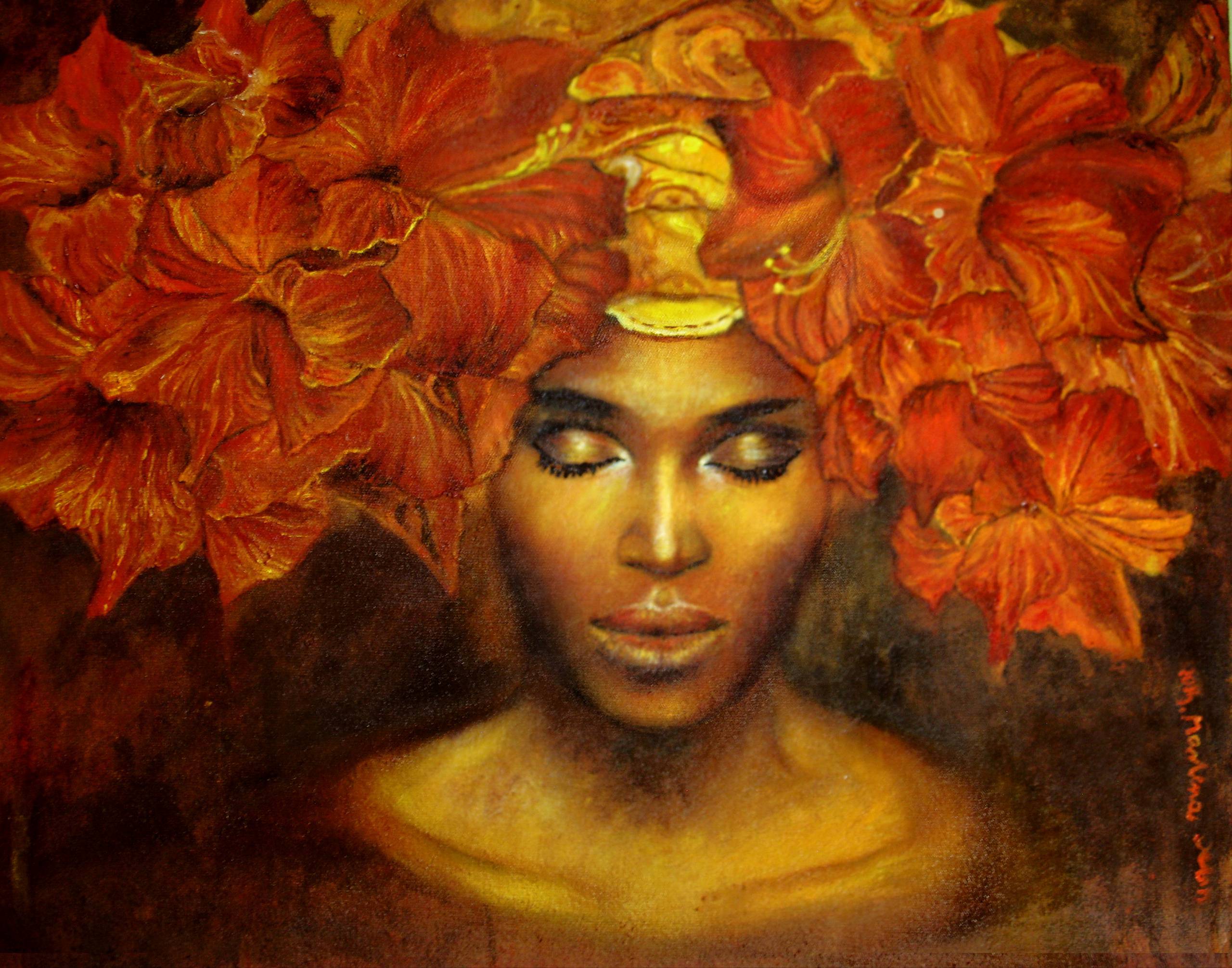 Obraz, który widzisz, eksploduje feerią ciepłych barw – dominują głęboki pomarańcz i złociste odcienie. Główna postać zdaje się emanować spokojem, jej zamknięte oczy i lekko rozchylone usta tworzą aurę medytacyjnego skupienia. Kwiaty, które zdobią jej głowę, wyglądają jakby były prawdziwe, pełne dynamizmu i życia. To jakby natura i człowiek stali się jednym. Kompozycja obrazu jest symetryczna, co daje poczucie harmonii. Atmosfera jest mistyczna, wręcz magiczna. Można odnieść wrażenie, że jesteśmy świadkami czegoś niesamowitego. Obraz zdaje się szeptać o tajemnicach ukrytych w naturze. Wiesz, jest w tym coś captivating. Artysta sięgnął po techniki olejnej farby, które pozwalają na osiągnięcie gładkich przejść i subtelnych cieni. Widać tu precyzję i dbałość o detale, szczególnie w przedstawieniu tekstury kwiatów. Patrząc na ten obraz, można poczuć głęboki spokój, ale jednocześnie ciekawość. Co by było, gdyby można było wejść do takiego świata? Może to po prostu piękno, które ma nas zatrzymać na chwilę w codziennym biegu? Siedmiolatka powiedziałaby: "To pani z ogromnym kwiatem, jakby była królową kwiatów!" Takie dzieła zapraszają do refleksji nad miejscem człowieka w przyrodzie. Malunek na pewno na długo zostaje w pamięci.