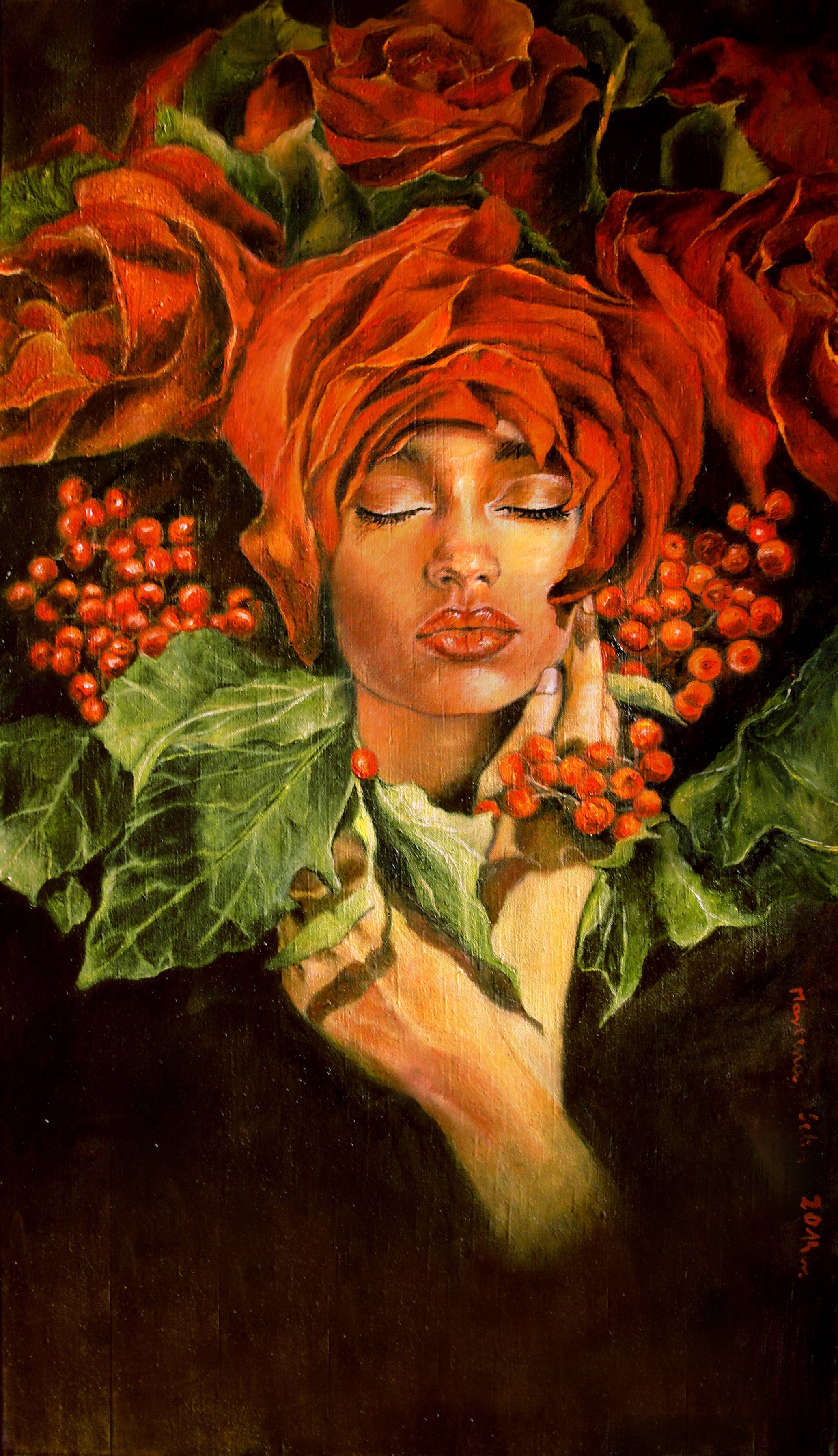 Obraz przedstawia niezwykłe połączenie kobiecej twarzy z naturą. Dominują w nim ciepłe kolory - delikatne odcienie czerwieni i pomarańczu przeplatają się z głęboką zielenią liści. Wszystko otacza ciemne tło, które podkreśla intensywność barw, tworząc kontrast i nadając dziełu głębię. Kompozycja jest nietypowa i niezwykle harmonijna, twarz kobiety wtapia się płynnie w kwiaty, jakby była ich naturalną częścią. Czuję niesamowity spokój, jakbym obserwował królową kwiatów w jej naturalnym środowisku. Styl artystyczny można zaklasyfikować jako surrealistyczny - artysta bawi się formą i łączy elementy w sposób nieoczywisty. Technika malowania zapewne obejmuje miękkie pociągnięcia pędzla, które dodają całości subtelności i lekkości. Obraz wywołuje mieszankę emocji - od zasłuchania w domniemane dźwięki natury po refleksję nad wewnętrznym spokojem. Dzieciak powiedziałby pewnie: „Pani ma czapkę z kwiatków!” Moje myśli dryfują ku refleksjom o więzi człowieka z naturą - jakiś „bond” wydaje się tutaj wyczuwalny. To dzieło oddziałuje na zmysły i budzi do życia uśpione strumienie wyobraźni.