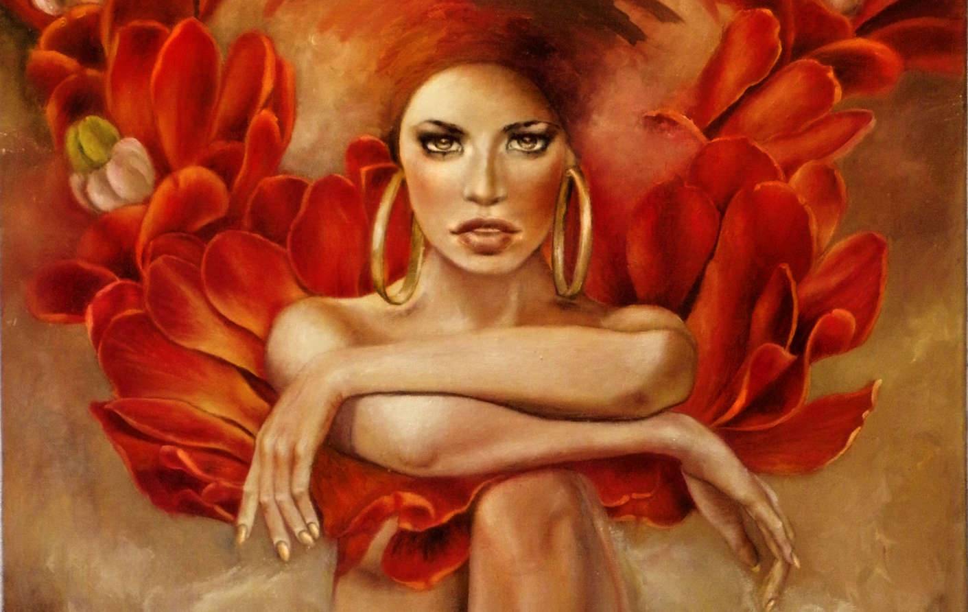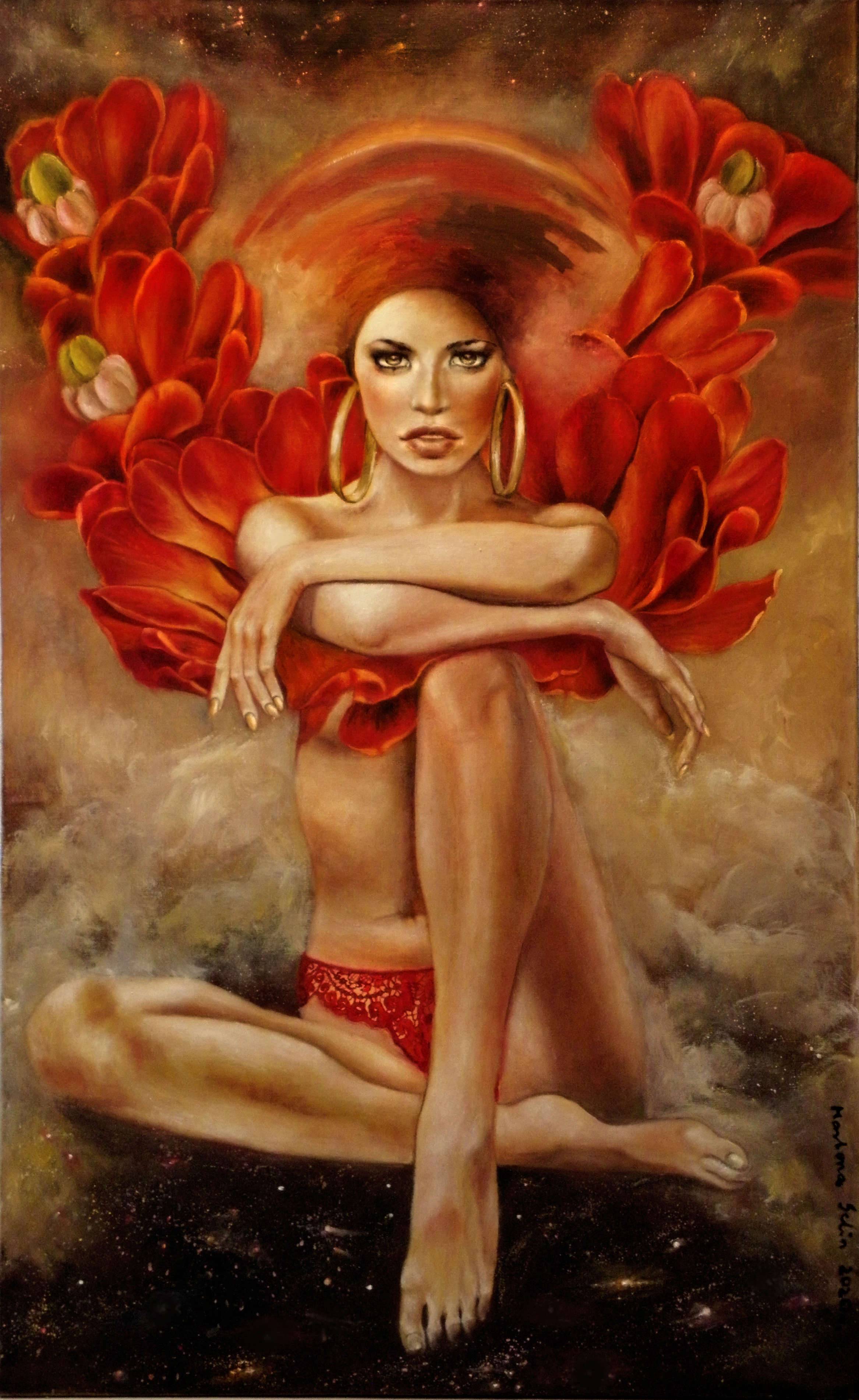 Obraz ukazuje kobietę otoczoną kwiatami o ognistoczerwonych płatkach, które tworzą wokół niej coś w rodzaju aureoli. Kolorystyka jest ciepła, dominują odcienie czerwieni i brązu, nadając całości niezwykle zmysłowy charakter. Sama postać siedzi z nogami skrzyżowanymi, otulona w pewny siebie wyraz twarzy, co dodaje kompozycji nutki tajemniczości. Kwiaty oplatające ją są jak płomienie, żywe i dynamiczne. Atmosfera obrazu jest pełna energii, niemal magiczna. Użyta technika to prawdopodobnie olej na płótnie. Widać miękkie przejścia kolorów, co nadaje całości subtelny wygląd. Detale twarzy są wyraziste, co przyciąga wzrok, a reszta obrazu emanuje delikatnością. Artysta bawi się światłem i cieniem, dodając całości głębi. Obraz może wywoływać różnorodne emocje u odbiorcy: od podziwu po zaintrygowanie. Może nawet nieco dezorientować, bo kto to widział, żeby kwiaty aż tak się rozrastały. Dla mnie jest niemal movie-like, sceneria stworzona do odkrycia. Jest w nim coś pięknego i niepokojącego jednocześnie. To jak sen, z którego nie chcesz się obudzić. Naprawdę mi się podoba, taki magiczny.