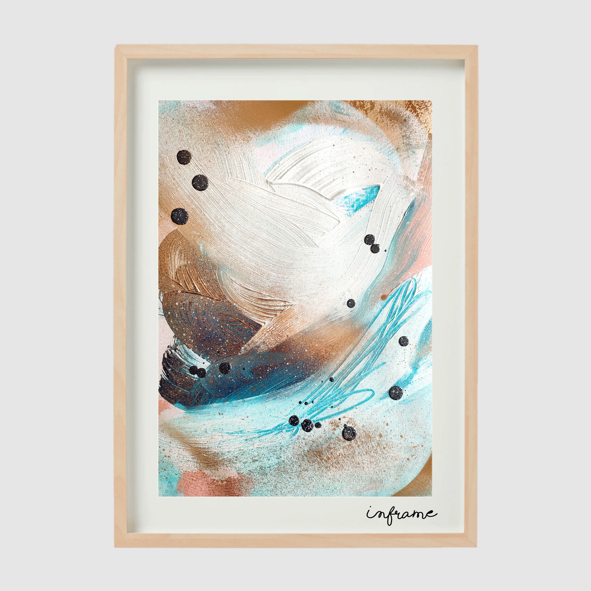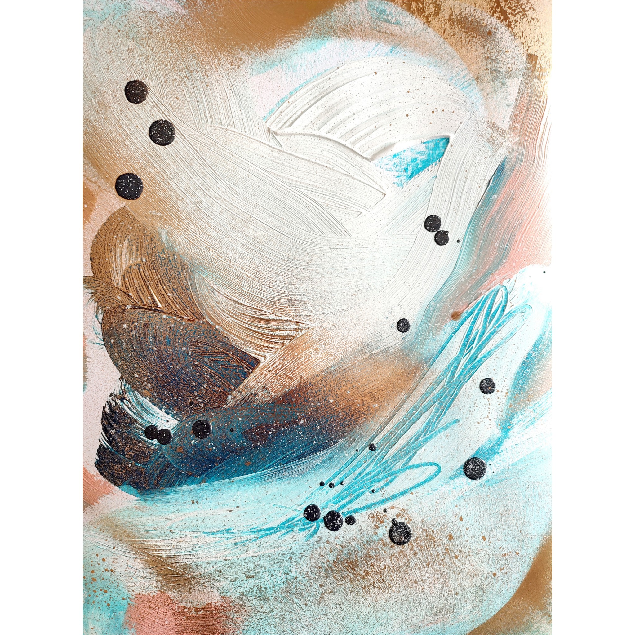 Obraz akrylowy namalowany na papierze o gramaturze 250g/m2 zainspirowany morzem w odcieniach bieli, złota i turkusu. Widoczna delikatna struktura. Nieoczywisty, bajkowy, fantazyjny. Obraz sprzedawany bez ramy.