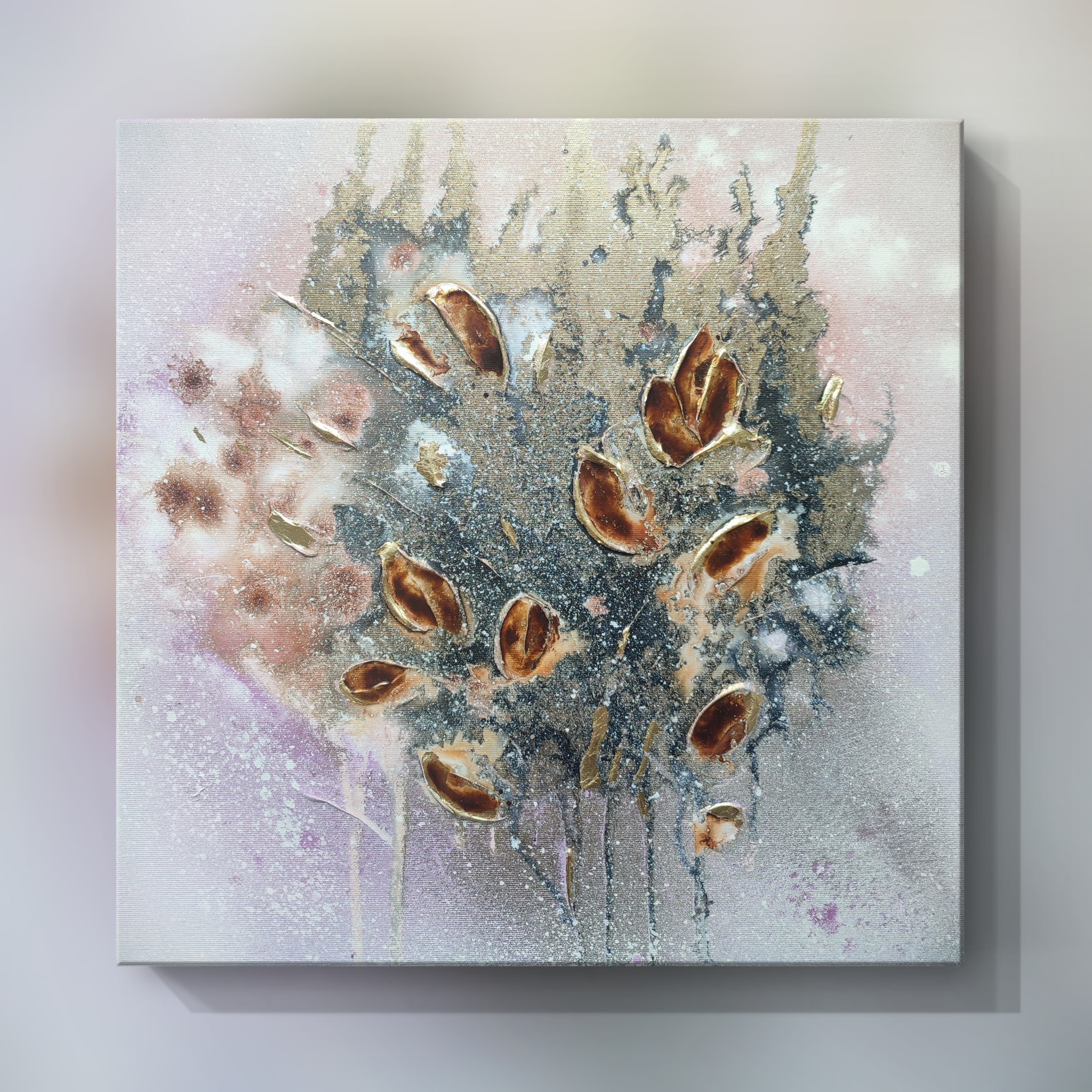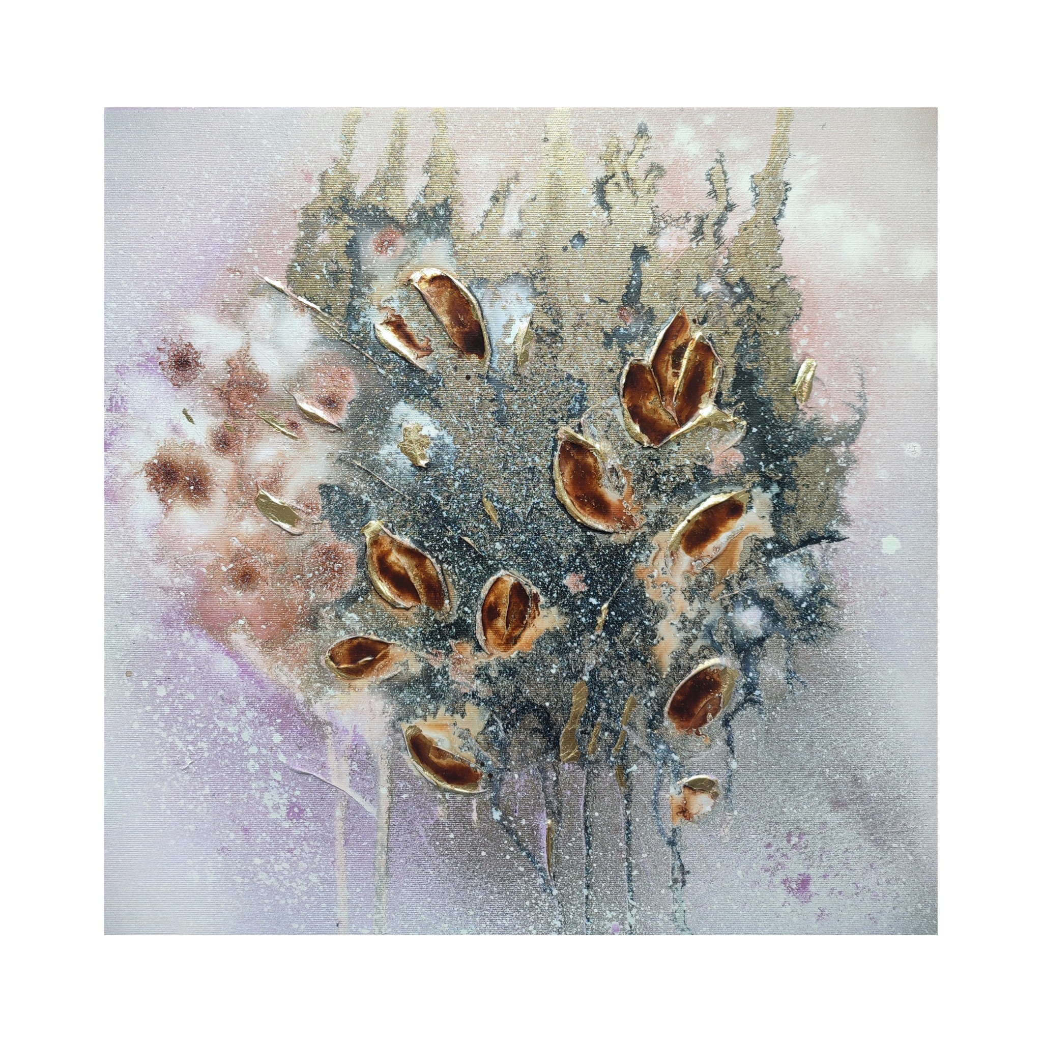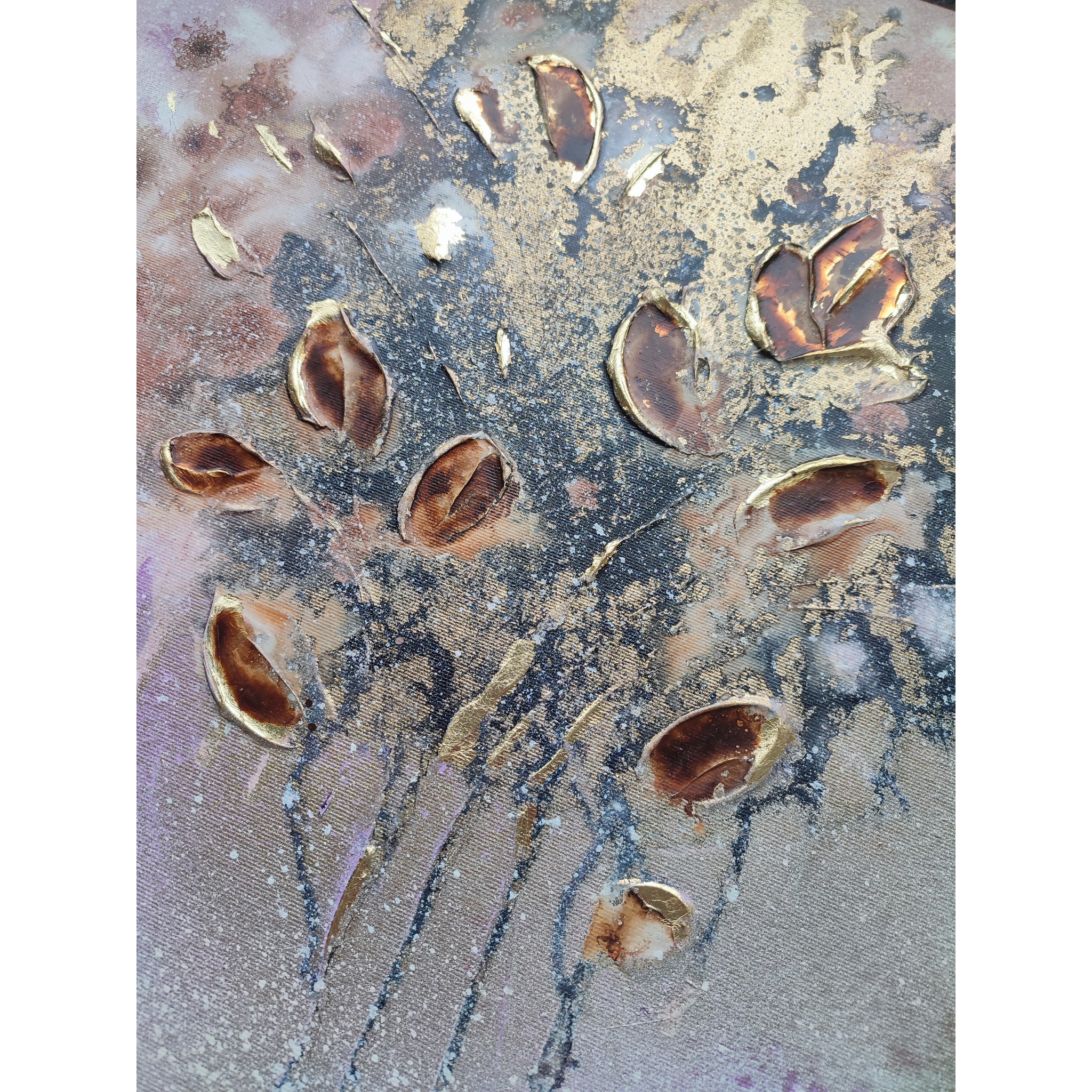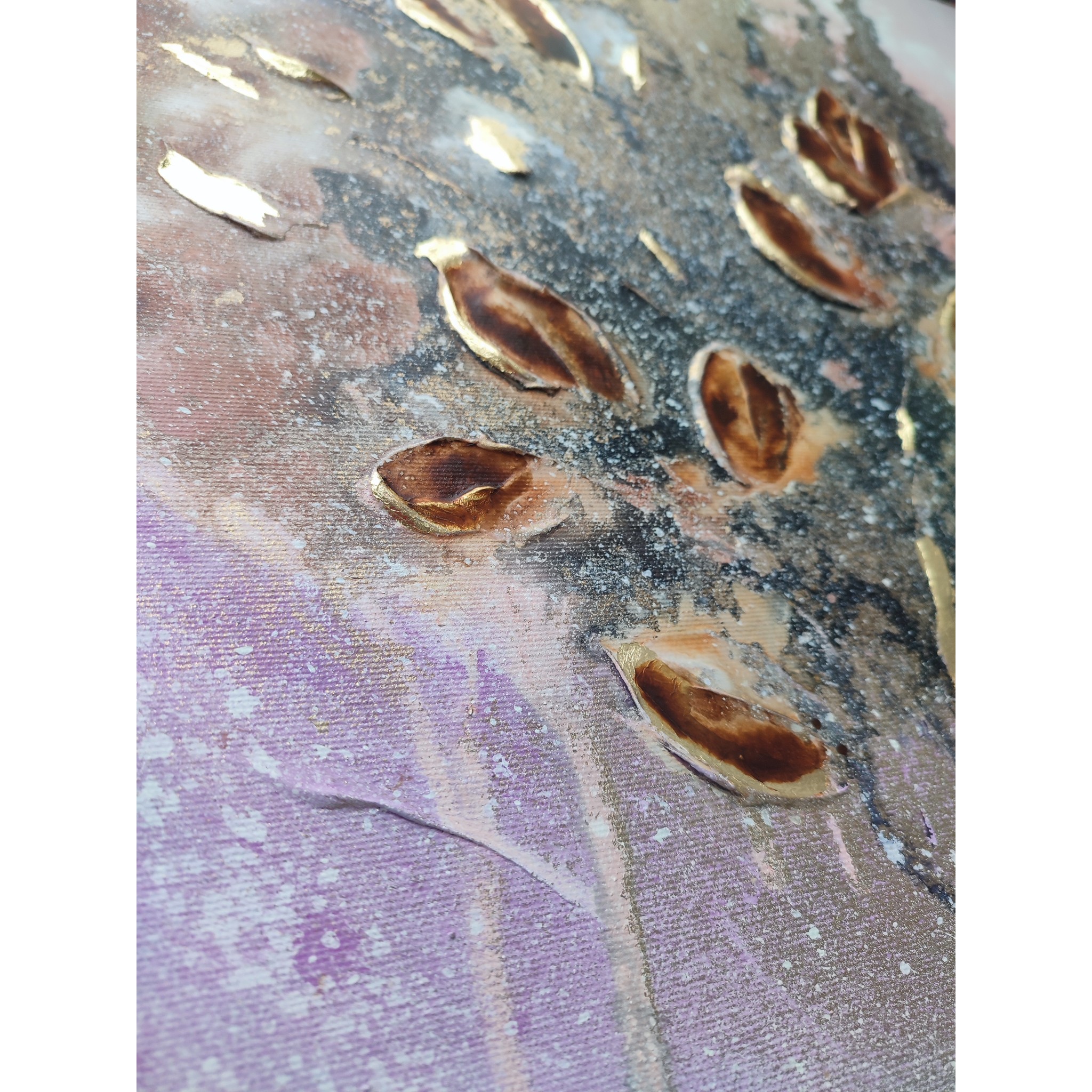 Strukturalny obraz akrylowy namalowany na włoskim bawełnianym płótnie. Intensywna struktura oraz złoto nadają pracy mocnego charakteru. Obraz mieni się w zmieniającym się świetle dnia. Boki obrazu zamalowane na biało. Gotowy do powieszenia. Kolory mogą nieznacznie różnić się w rzeczywistości.