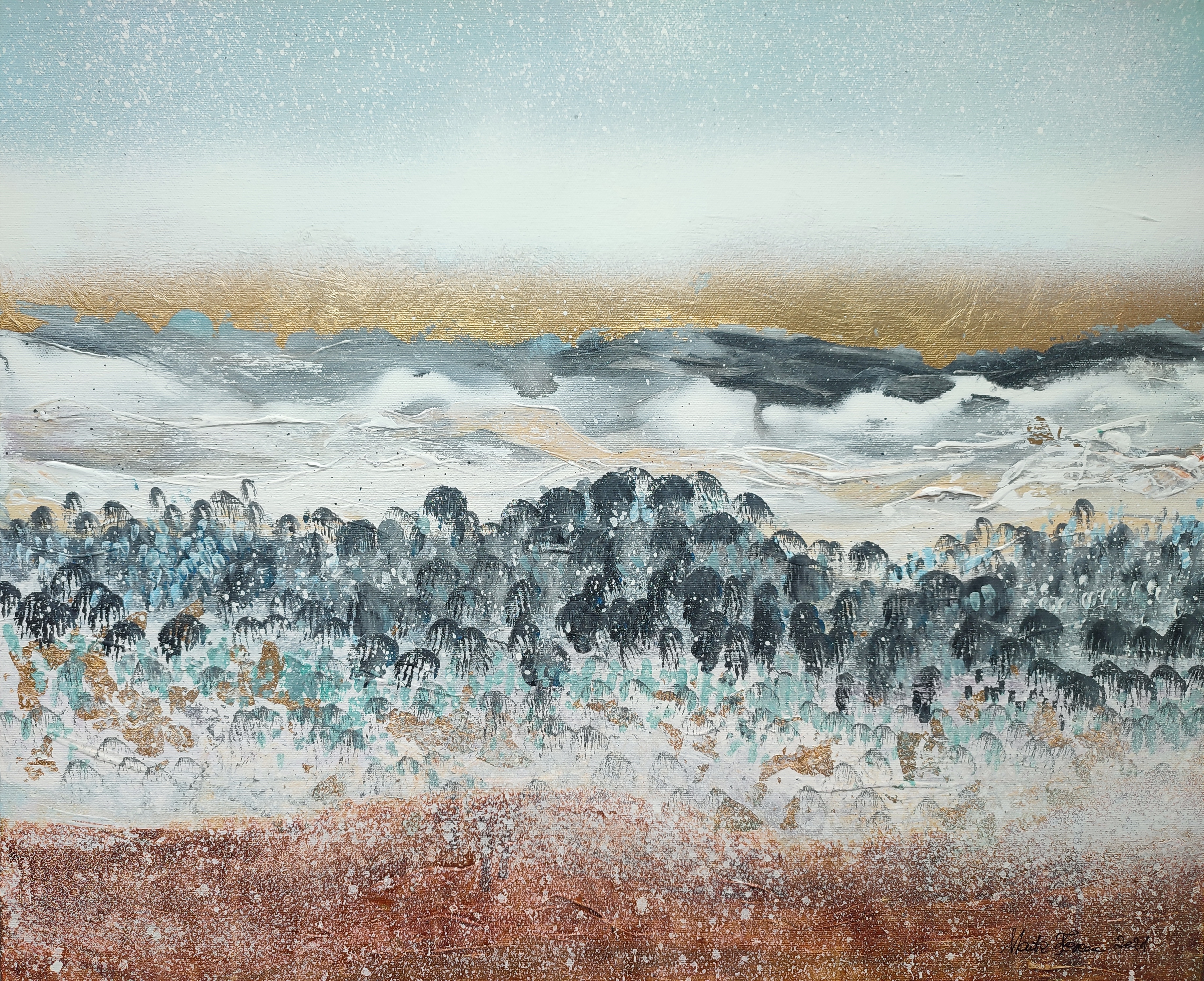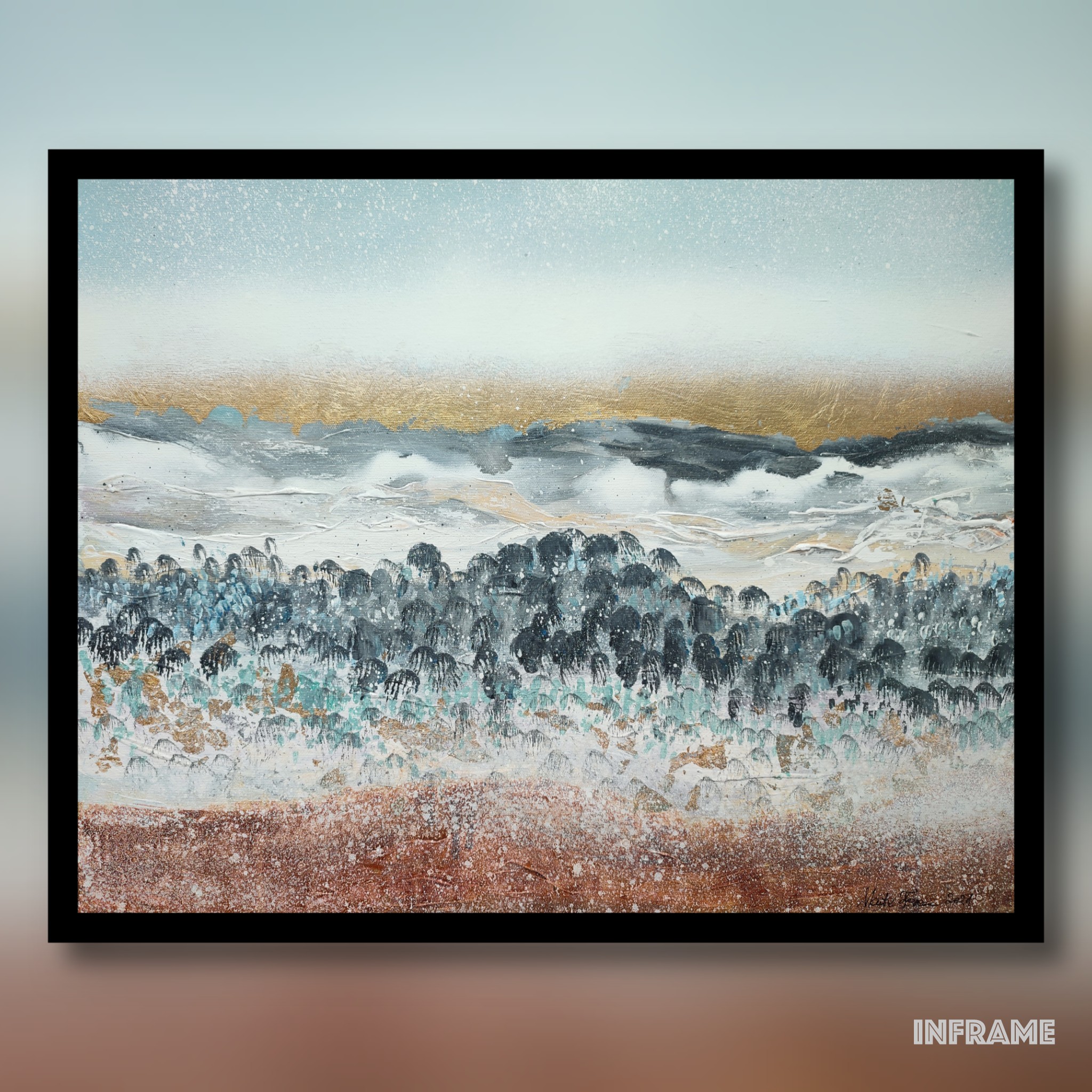 Piękny obraz akrylowy namalowany na włoskim bawełnianym płótnie. Nostalgiczny pejzaż zimowy z dodatkiem płatków złota. Pięknie się mieni w zmieniającym się świetle dnia. Delikatna struktura. Boki obrazu zamalowane na biało. Gotowy do powieszenia. Kolory obrazu mogą nieznacznie różnić się w rzeczywistości.