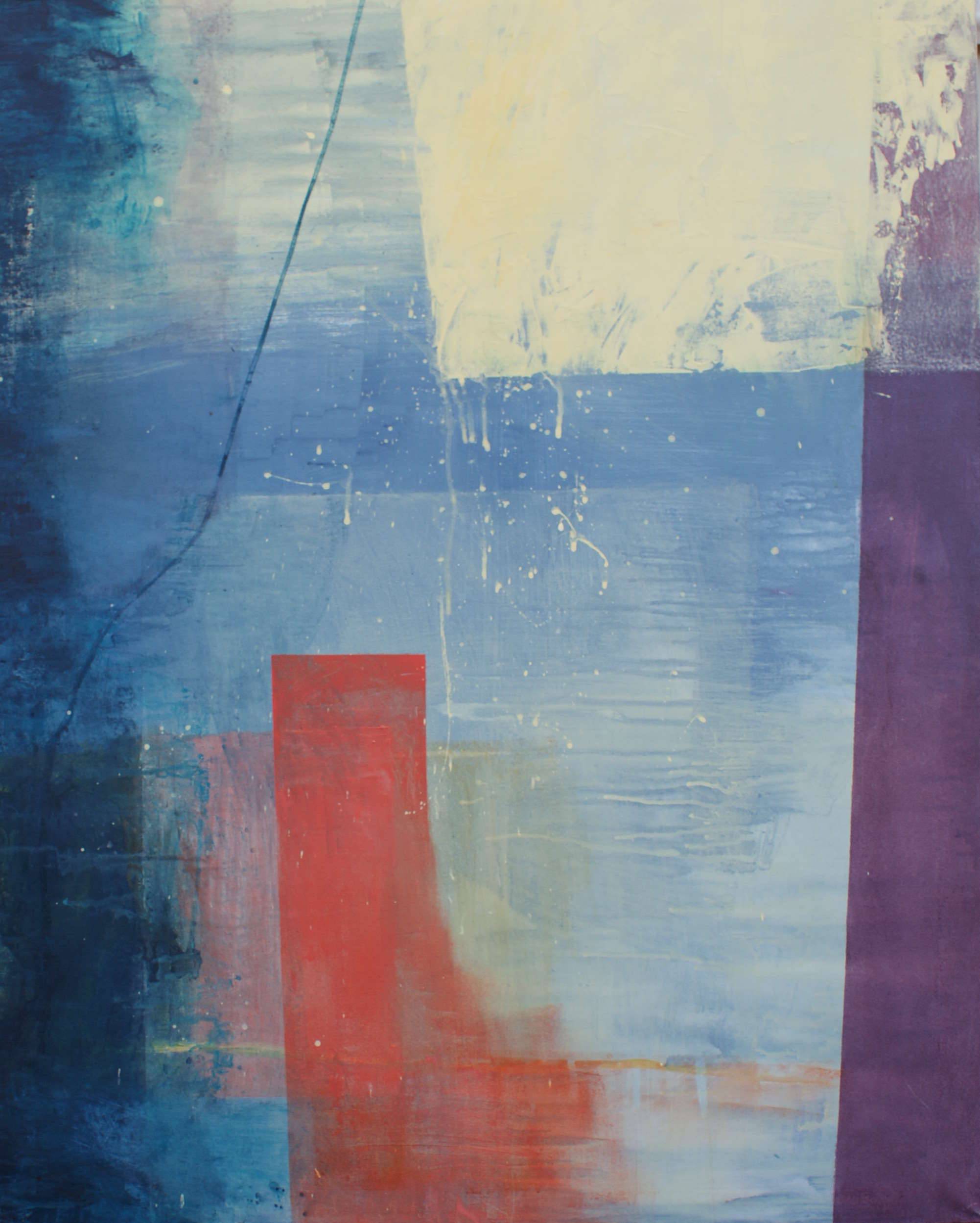 Abstrakcja malarska w błękitnej tonacji, z akcentami czerwieni, fioletu i żółci. Obraz wykonany techniką malarstwa akrylowego na płótnie o wymiarach 100x81 cm.