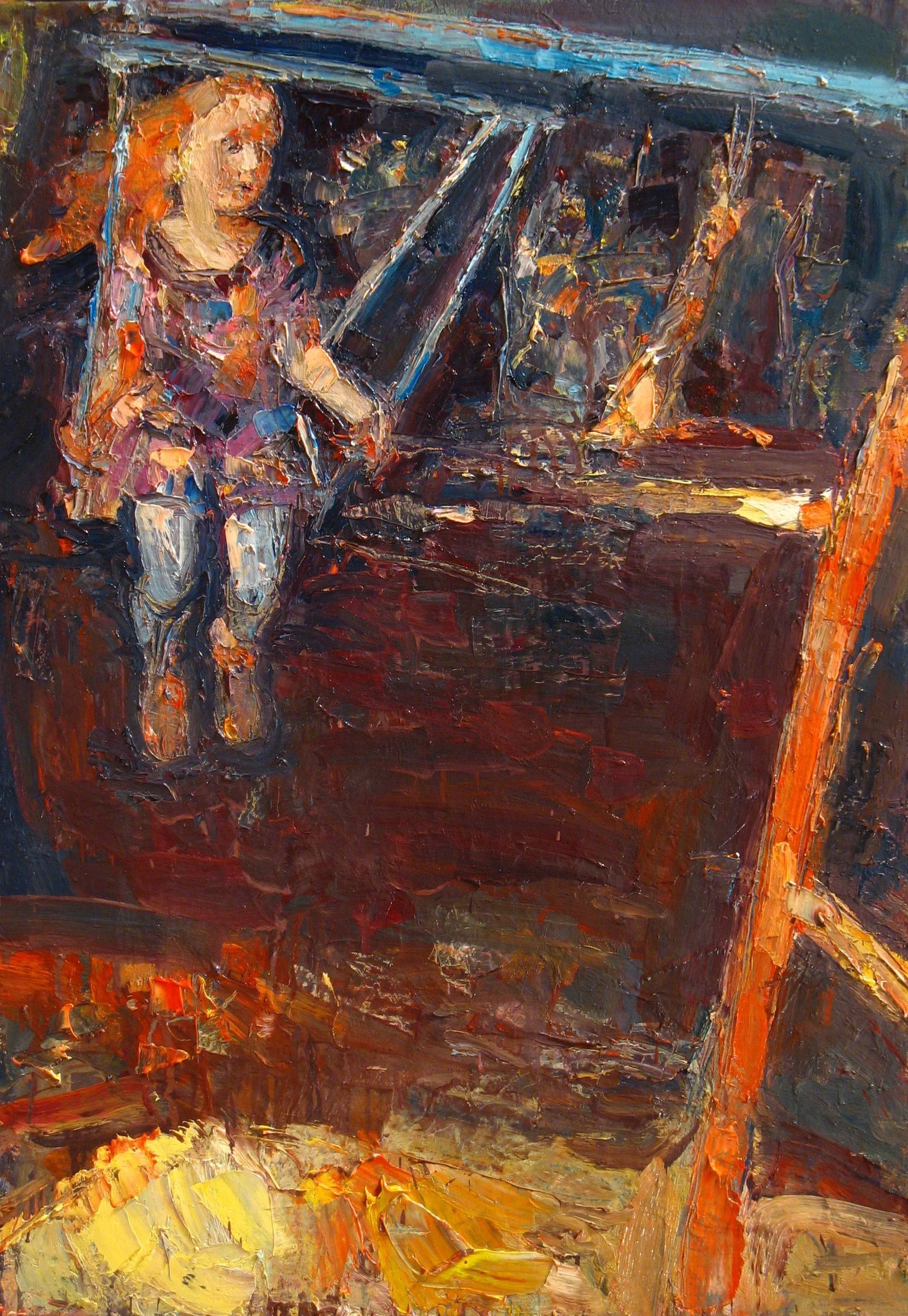 Obraz emanuje dynamicznym połączeniem kolorów i faktur, dzięki czemu od razu przyciąga wzrok. Dominują ciepłe odcienie brązów, czerwieni i pomarańczy, które kontrastują z chłodnymi, niebieskimi akcentami. Centralną postacią jest dziewczynka o rudych włosach, siedząca na huśtawce. Otaczają ją ekspresyjne, chaotyczne plamy farby, co dodaje całości nieco niespokojny charakter. Kompozycja jest pełna ruchu, co sprawia, że cały obraz wydaje się pulsować energią. Naszcza pochłaniająca atmosfera przenika całe dzieło. Jest to mieszanka nostalgii z lekką nutą tajemniczości. Wydaje się, jakby artysta chciał uchwycić ulotne chwile dzieciństwa, momenty pomiędzy snem a jawą. Wyraźne, impastowe pociągnięcia pędzla nadają obrazowi trójwymiarowość i siłę wyrazu. Styl malarski jest zdecydowanie ekspresjonistyczny, gdzie emocje przeważają nad realistycznym odwzorowaniem rzeczywistości. Obraz może wywoływać u odbiorcy różnorakie uczucia - od radości związanej z beztroskimi chwilami dzieciństwa, po nieokreślony smutek, związany z przemijaniem. Przyglądając się temu dziełu, można poczuć się jak w środku childhood memory. 7-latek mógłby powiedzieć: "Wygląda, jakby dziewczynka bujała się wśród kolorowych chmur!". Artysta daje nam możliwość zanurzenia się w świecie marzeń i osobistych refleksji, co sprawia, że oglądanie tego obrazu staje się niezwykłą przygodą.