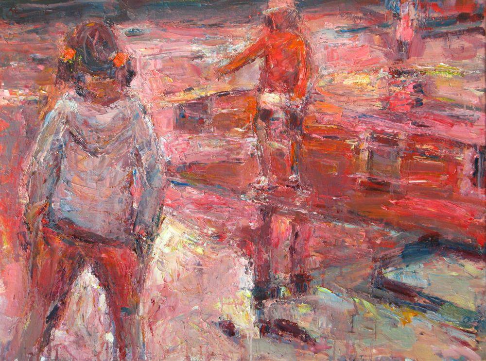 Na obrazie dominują ciepłe odcienie różu i czerwieni, mieszając się z ziemistymi tonami, co tworzy dynamiczną, niemal płomienną kompozycję. Dwoje postaci, choć nie do końca wyraźnych, zdaje się poruszać w pełnym niepokoju otoczeniu. Kiedy patrzę na te niewyraźne sylwetki, wyczuwam pewną nostalgię i melancholię. Artysta posłużył się tu impastyczną techniką, nakładając farbę grubymi warstwami, co nadaje obrazowi tekstury i głębi. Emocje, które mogą wywołać się intensywne – trochę jakby ktoś rzucił farbą z impetem, pewnego rodzaju chaos. Atmosfera obrazu jest jak slow jazz w deszczowy wieczór: pełna subtelnych napięć i ukrytych emocji. Kierunek spojrzeń postaci wskazuje na niewidzialne połączenie, może niewypowiedziana historia między nimi. To obraz, który skłania do refleksji o przemijaniu i ludzkiej relacji. Iwona lubi rysować takie obrazki, bo są ciekawe. Doceniam, iż artysta potrafi tak dobrze uchwycić esencję chwili, pozostawiając widza z myślą: "What’s next?"