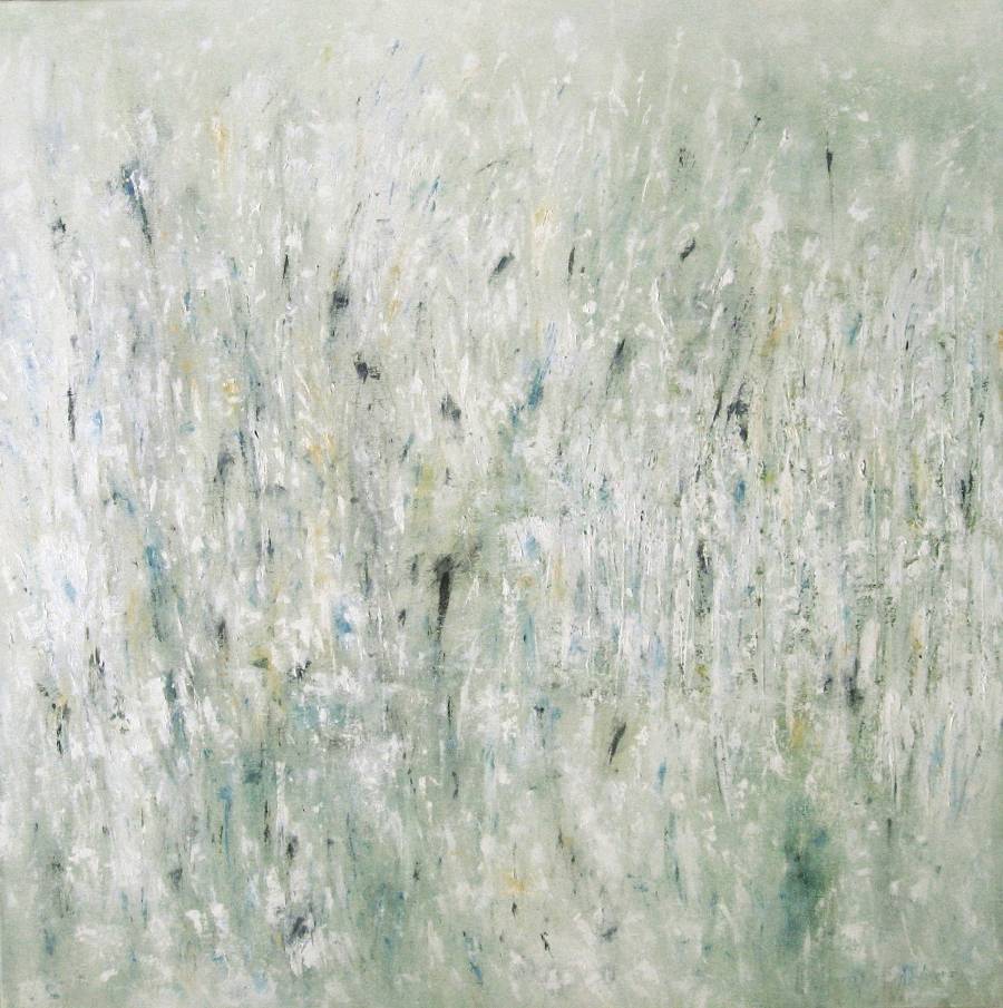 Olej na płótnie, abstrakcja z cyklu pejzaż przedwiośnie, akcenty błękitu, szarości, ochry i bieli