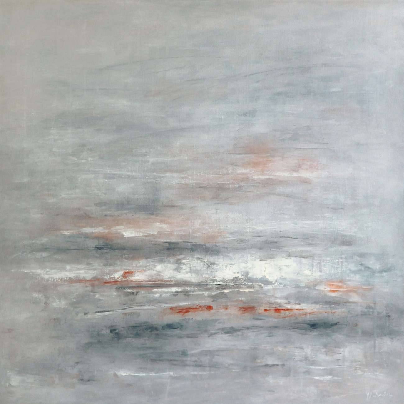 minimalistyczny pejzaż abstrakcji inspirowany zorzą, dominujące kolory szarości, biele, akcenty grafitu i oranżu, technika olejna