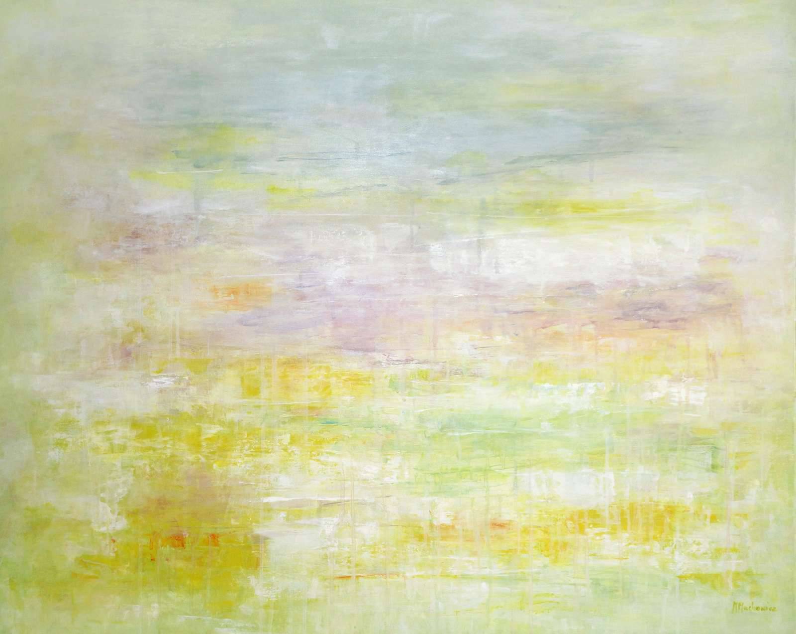 lekka abstrakcja, inspiracja ciepłymi kolorami lata, łąką, tęczą, dominująca paleta jasnych kolorów żółty, akcenty pomarańczy, lila błękitu, zieleni i bieli