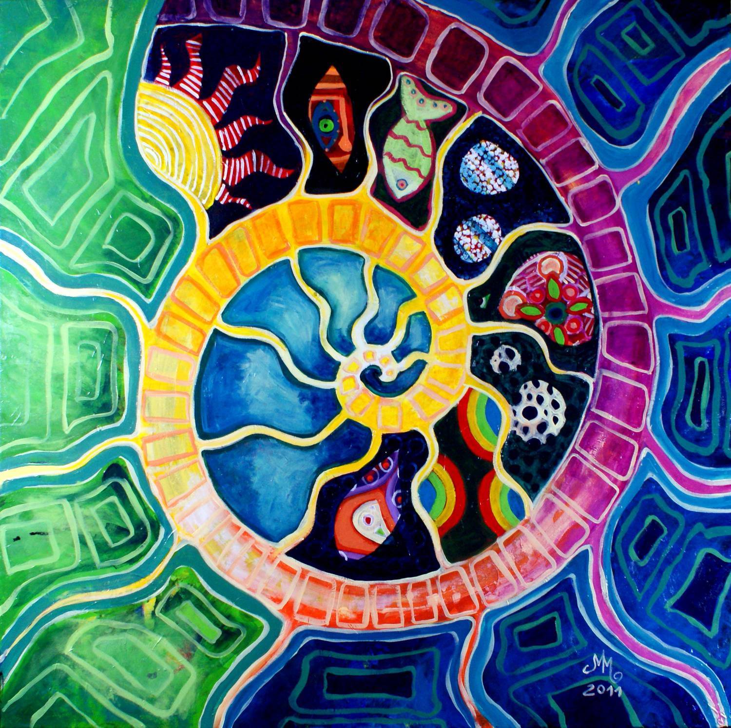 Obraz jest prawdziwym kalejdoskopem barw. Dominują na nim intensywne zielenie i niebieskości, które przeplatają się z żółciami i pomarańczami niczym barwna układanka. Centralnym elementem jest spiralna forma, przypominająca muszlę, złożona z żółtych segmentów, która zdaje się pulsować energią życiową. Wokół niej widzimy mnóstwo małych, symbolicznych elementów jak ryby czy abstrakcyjne wzory. Kompozycja jest dynamiczna, a każdy szczegół zdaje się opowiadać swoją własną historię. Atmosfera obrazu jest radosna i pełna życia. Może wywoływać w odbiorcy uczucia odkrywania i zachwytu nad pięknem natury. Styl artystyczny jest zdecydowanie surrealistyczny, z elementami symbolizmu. Kolory są żywe, a linie wyraźne, co może przywodzić na myśl dziecięcy entuzjazm w odkrywaniu śwata. Patrząc na ten obraz, można poczuć się jak podróżnik w magicznym ogrodzie pełnym skarbów. Wykorzystane techniki malarskie sugerują, że artysta posłużył się farbami akrylowymi, co nadało dziełu intensywność i głębię. Coś w rodzaju "wow", które wyrywa się z ust na widok tej feerii barw. Świetliste kolory i symetryczne kształty potrafią wprawić w zachwyt nawet najbardziej sceptycznych widzów. Dla siedmioletniego dziecka mogłoby to wyglądać jak świat pełen rybek i magicznych kół. Ten obraz wywołuje uśmiech i sprawia, że człowiek chce zanurzyć się w tej kolorowej krainie, odkrywając jej sekrety krok po kroku. Coś w nim jest dreamlike, niemalże zabiera nas w podróż do innej rzeczywistości.